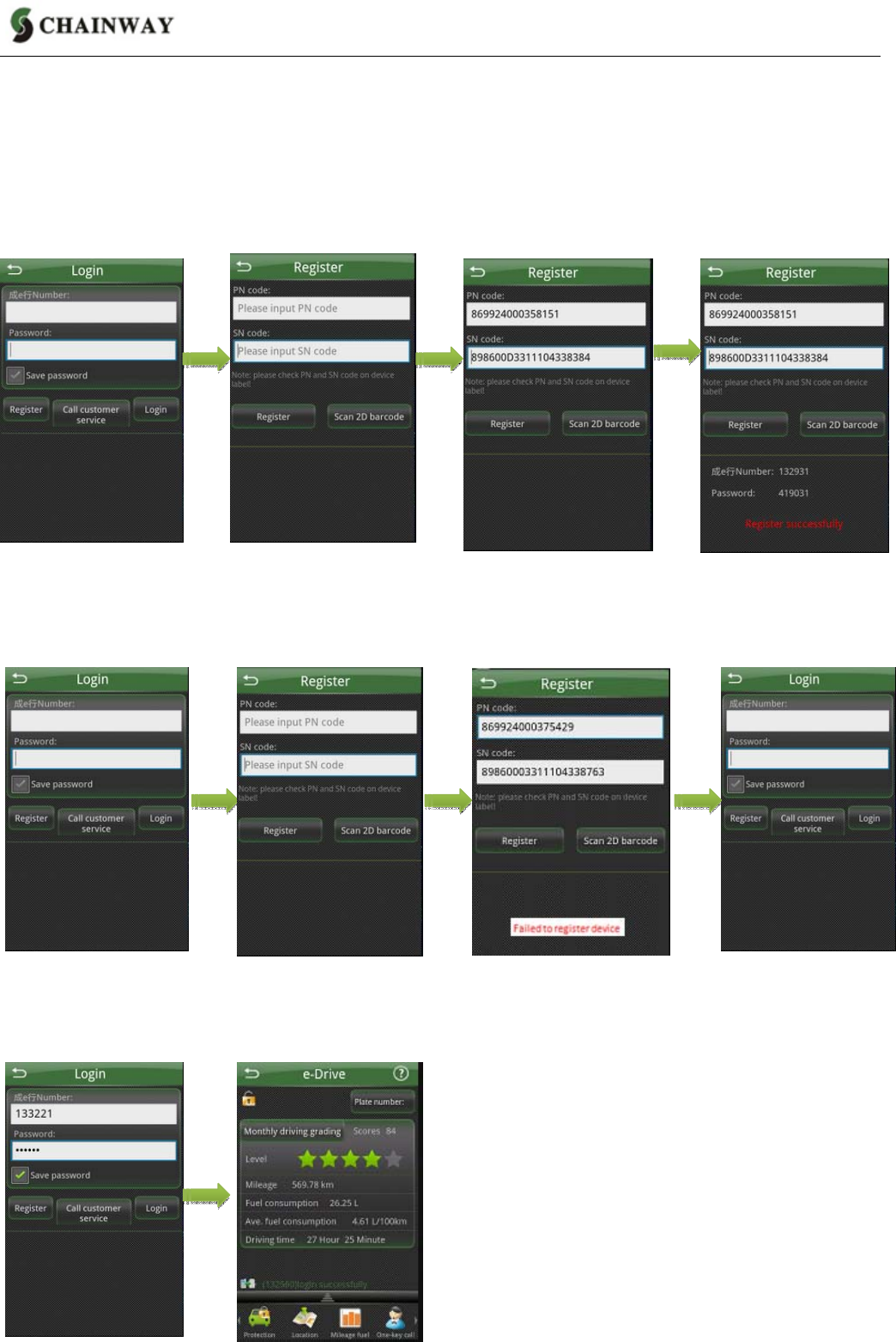 Login e-Drive APP -> Register -> Scan 2D code (on device) -> Register e-Drive number -> Register