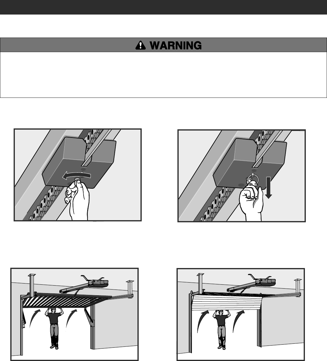If possible, use manual release to disengage trolley ONLY when gate/door is CLOSED. Weak or broken springs or unbalanced gate/door could