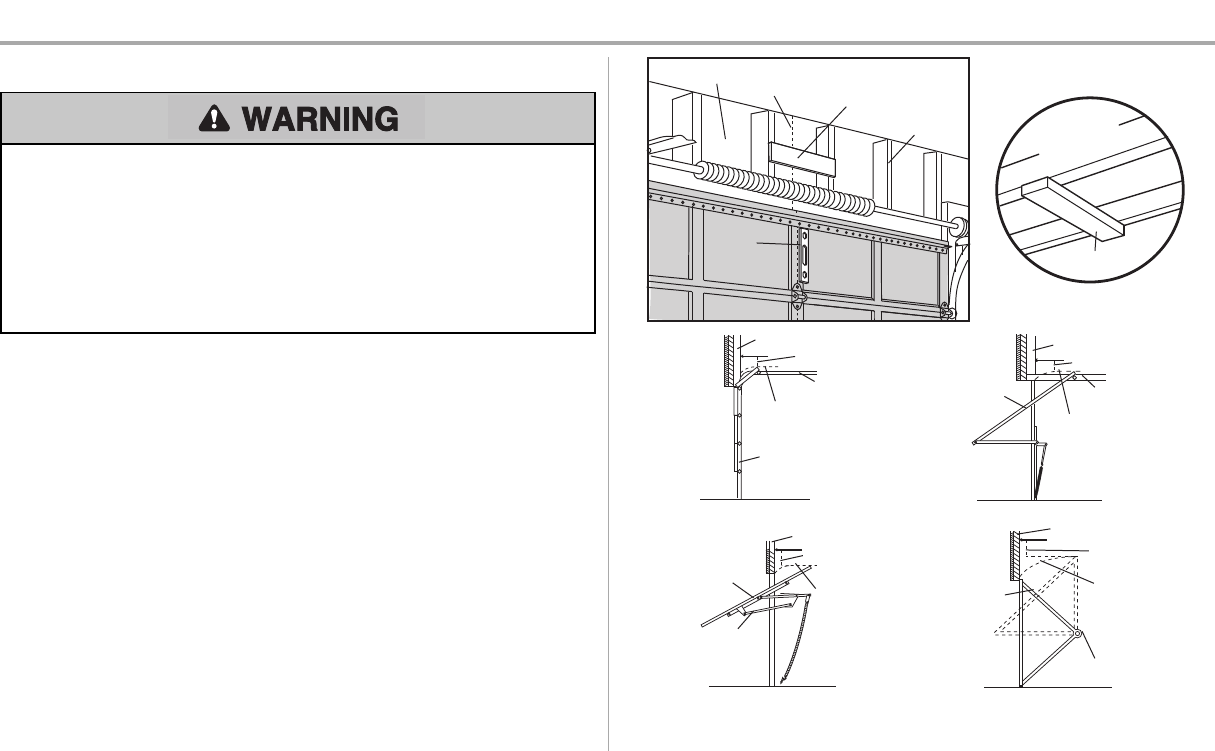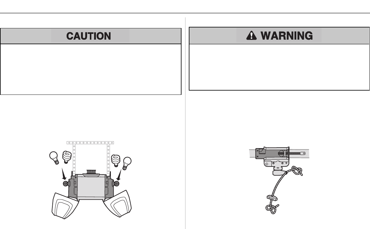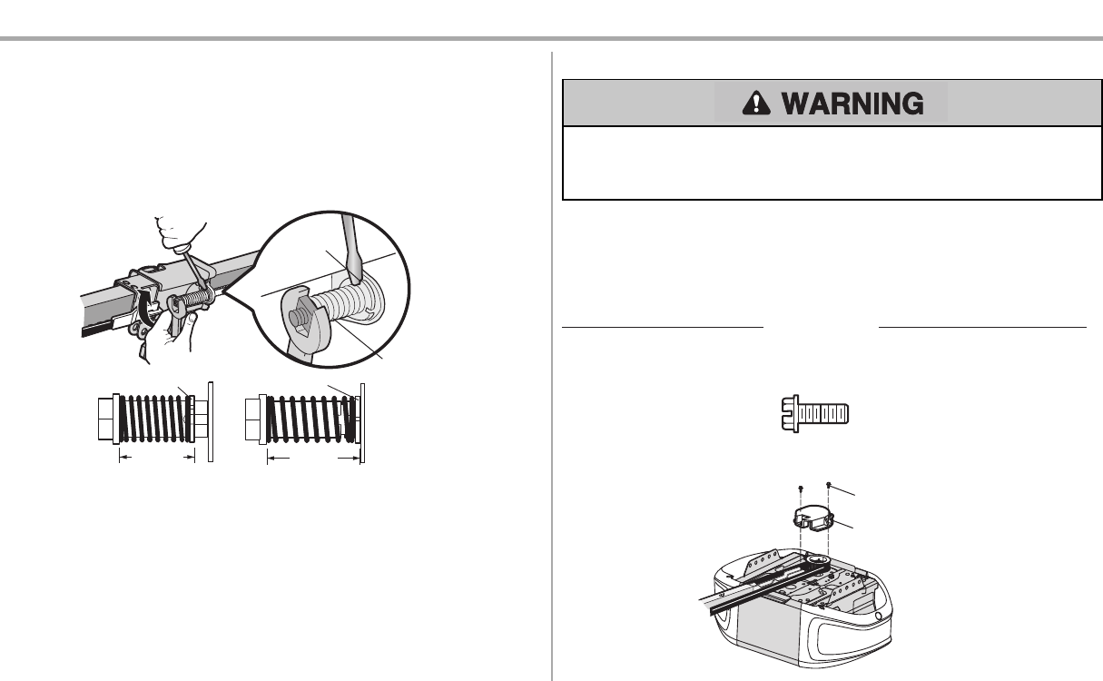 lNEVER try to loosen, move or adjust garage door, door springs, cables, pulleys, brackets or their
