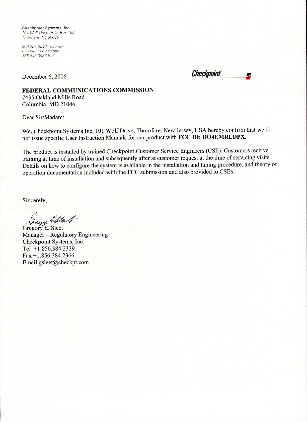 Checkpoint Systems Inc Electronic Article Surveillance Detection System users manual
