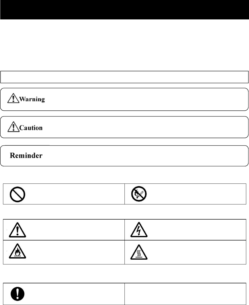 The symbols and the equipment illustrations in this manual are for the safe usage of this equipment.