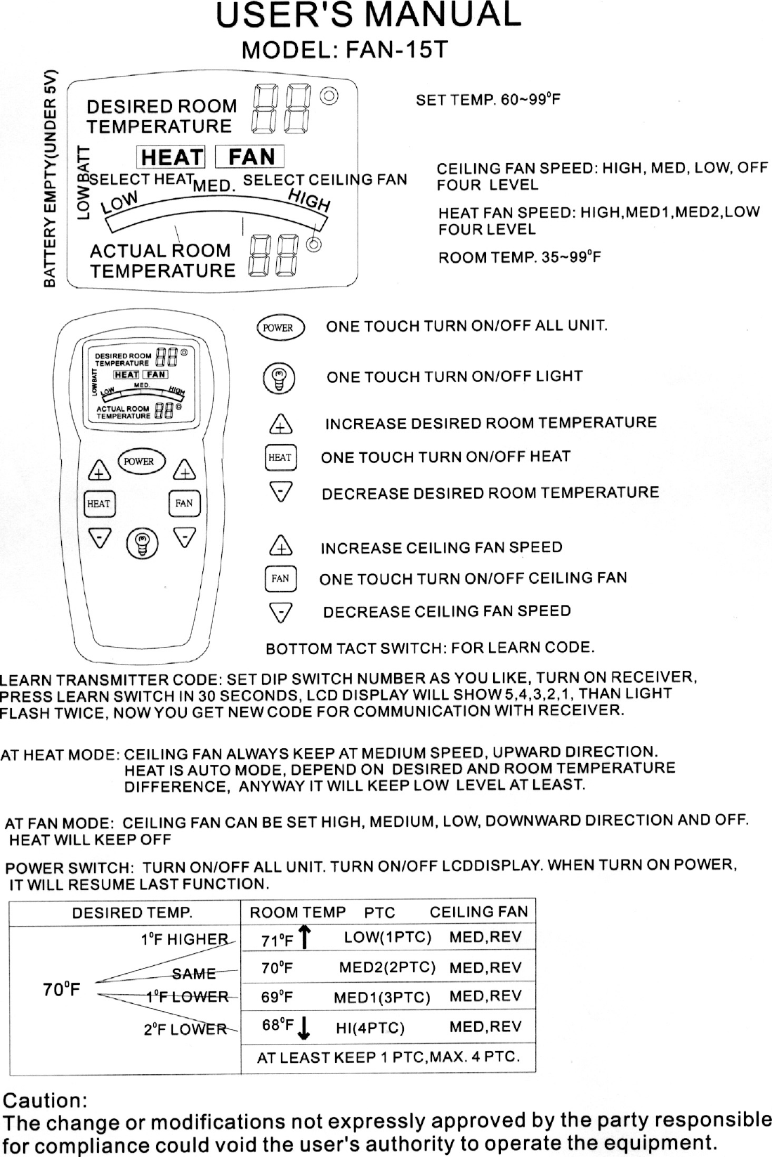 Chia Wei Electric Co FAN15T Remote Control User Manual