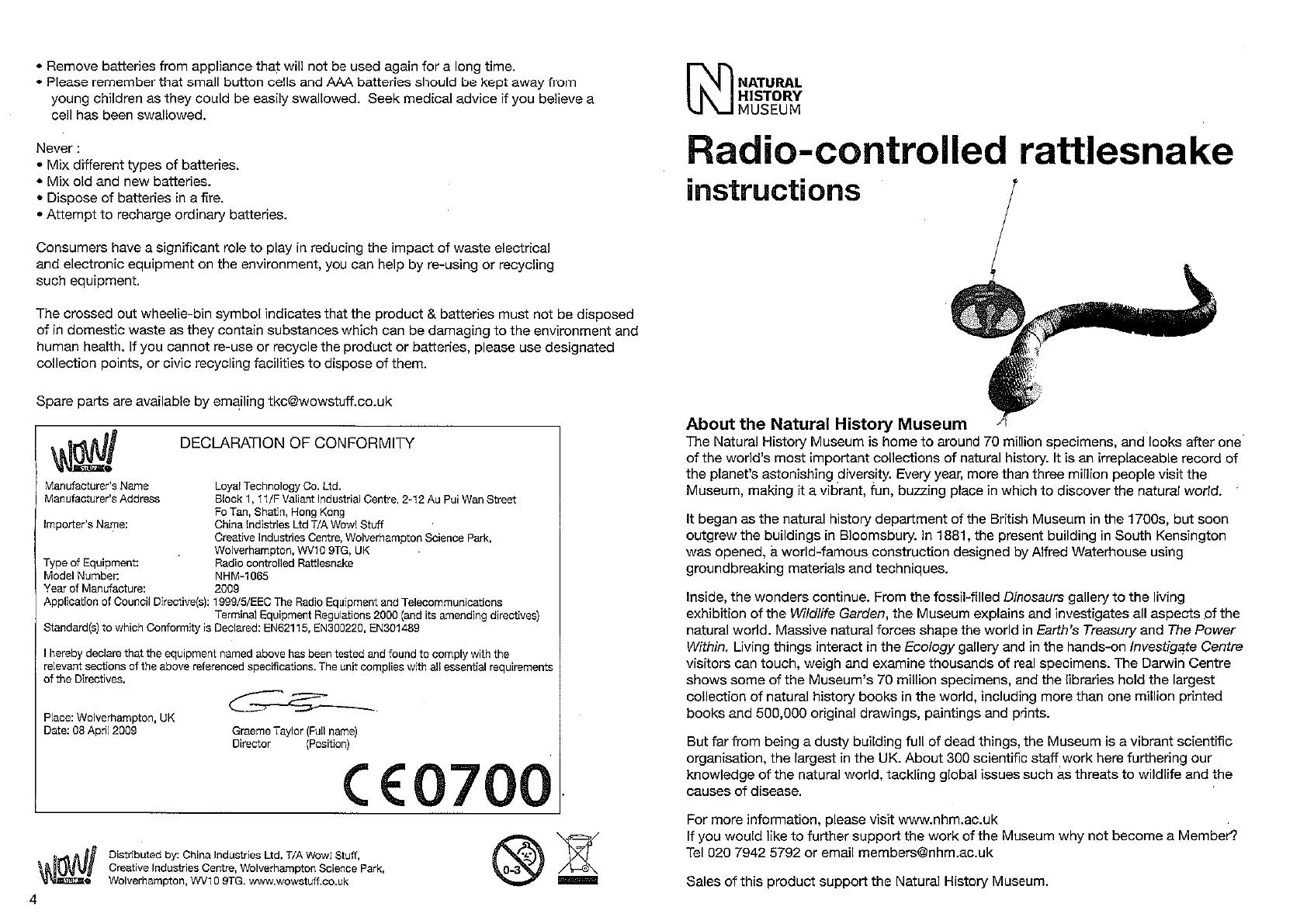 China Industries Ltd T/A Wow! Stuff RADIO CONTROLLED RATTLESNAKE - TX INSTRUCTION MANUAL