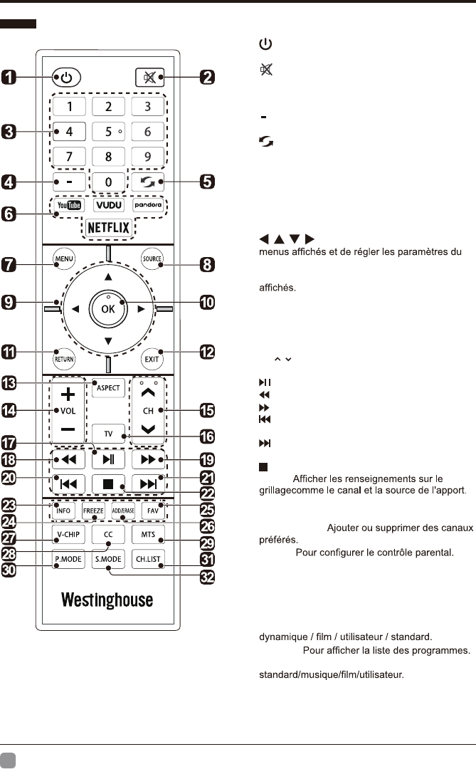 32. S.MODE: Pour sélectionner le mode audio :