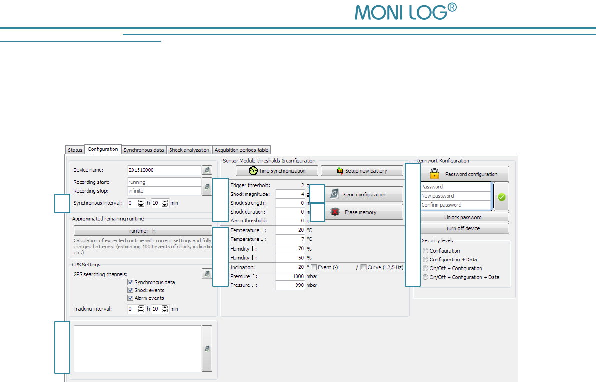 The input fields below (Figure 34, no. 2 u. 3) allow to parametrise the alarm events. By means of