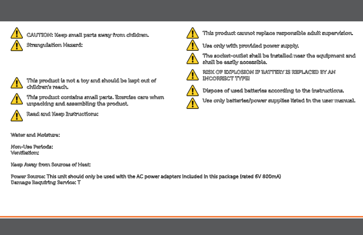 Power Source: This unit should only be used with the AC power adapters included in this package (rated 6V 800mA)