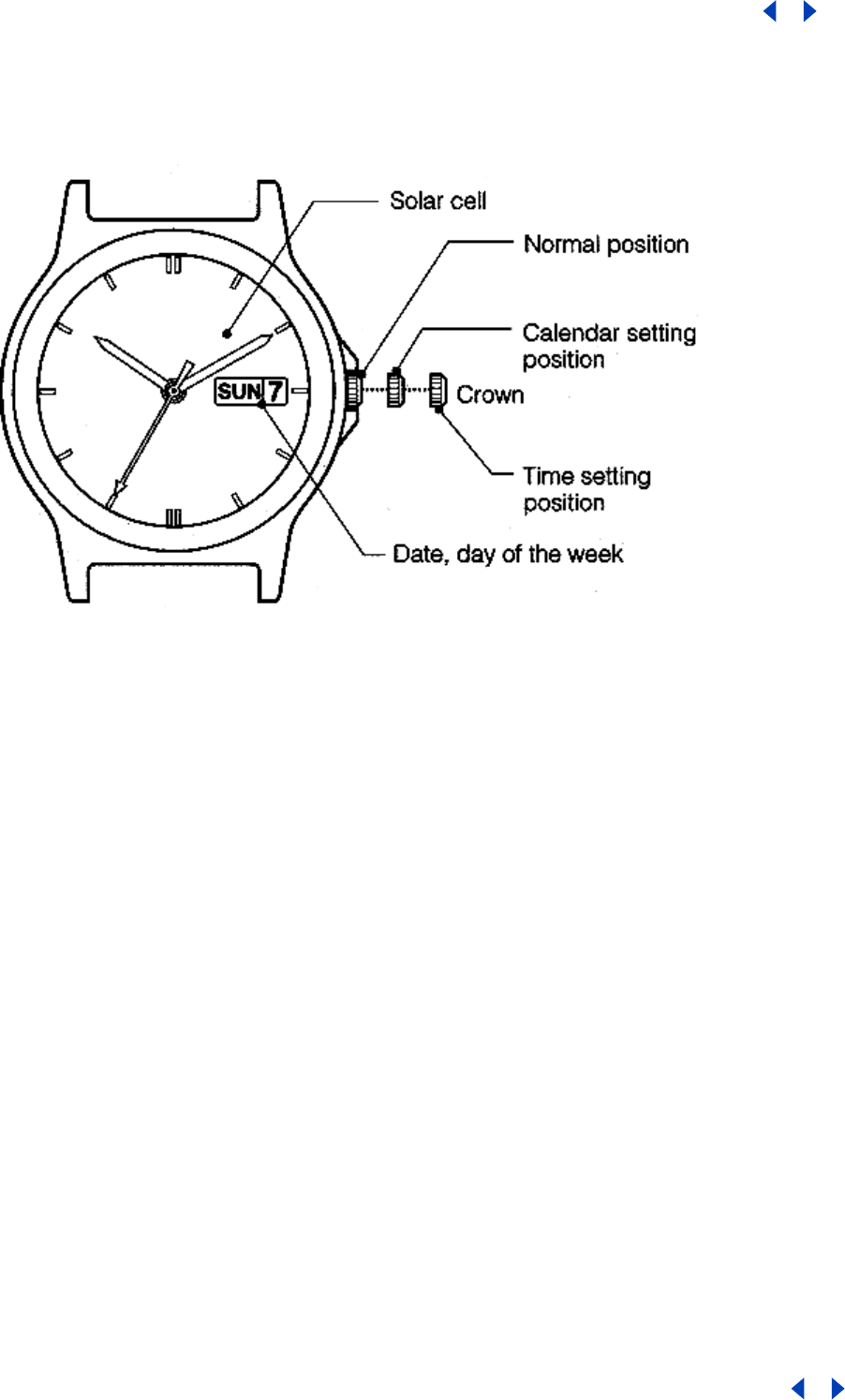 1. Pull the crown out to the first click (calendar setting position).