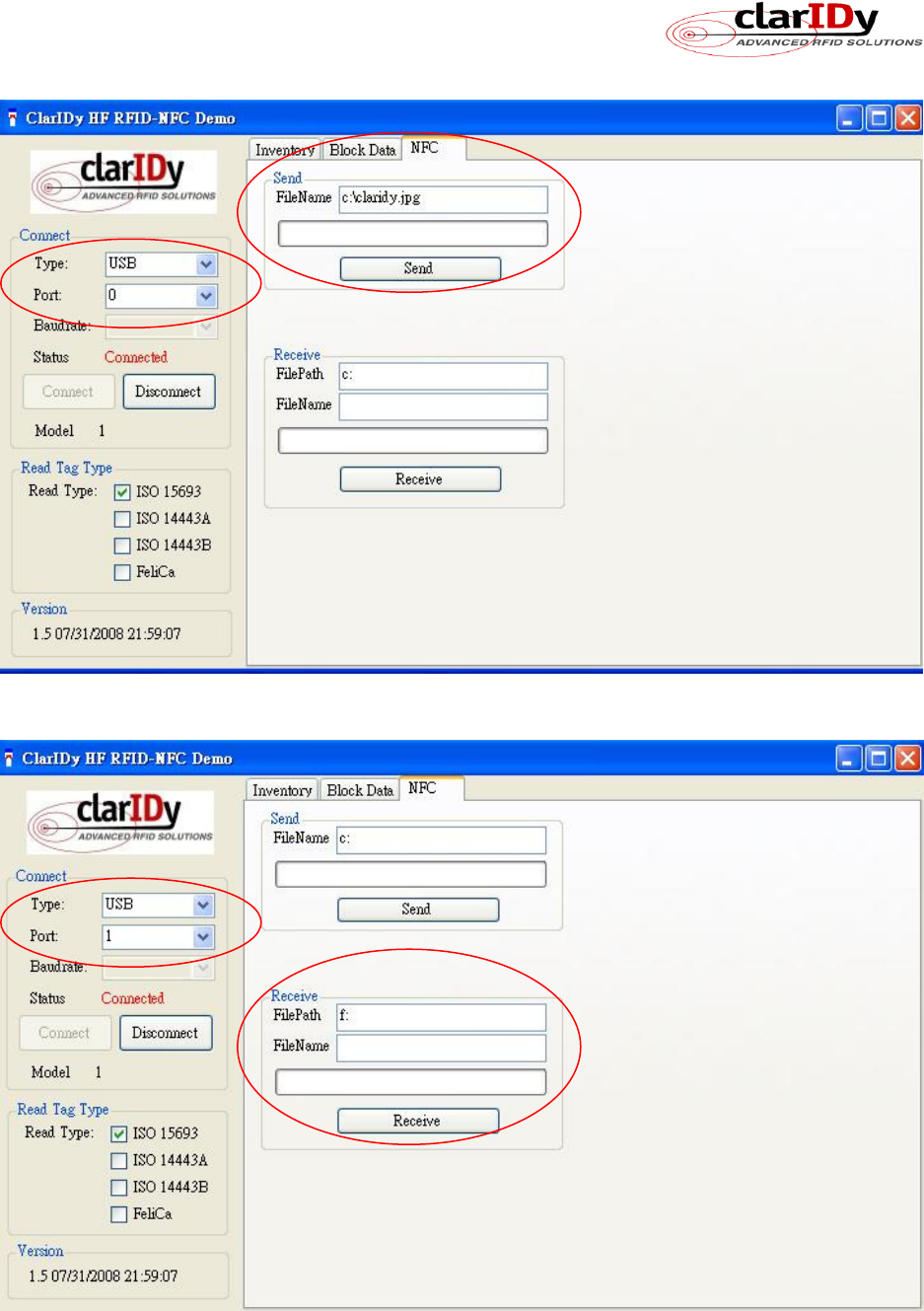 “ClarIDy HF Demo” programs. Connect both of them by “Port” 0 and “Port” 1 with “USB” Type