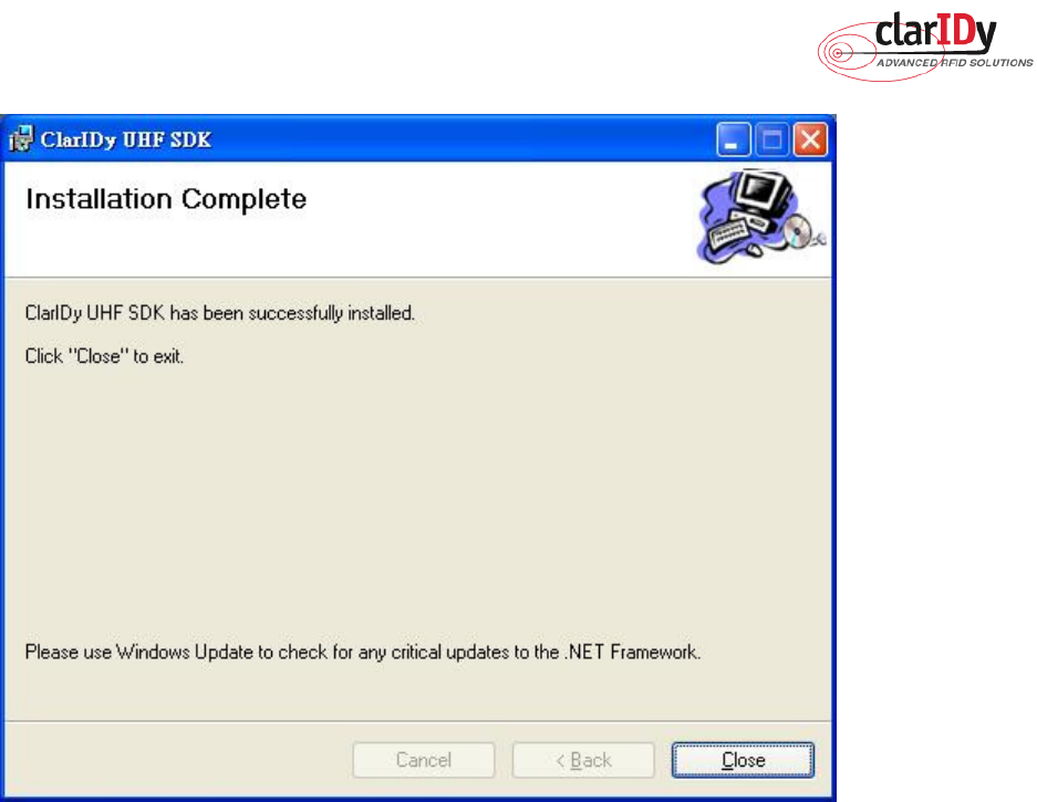 4. The “ClarIDy UHF Demo” is completed removed and click “Close” to close window, as