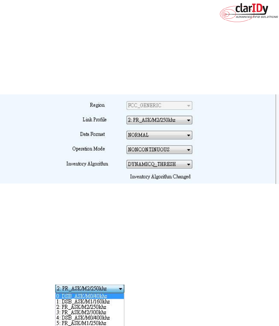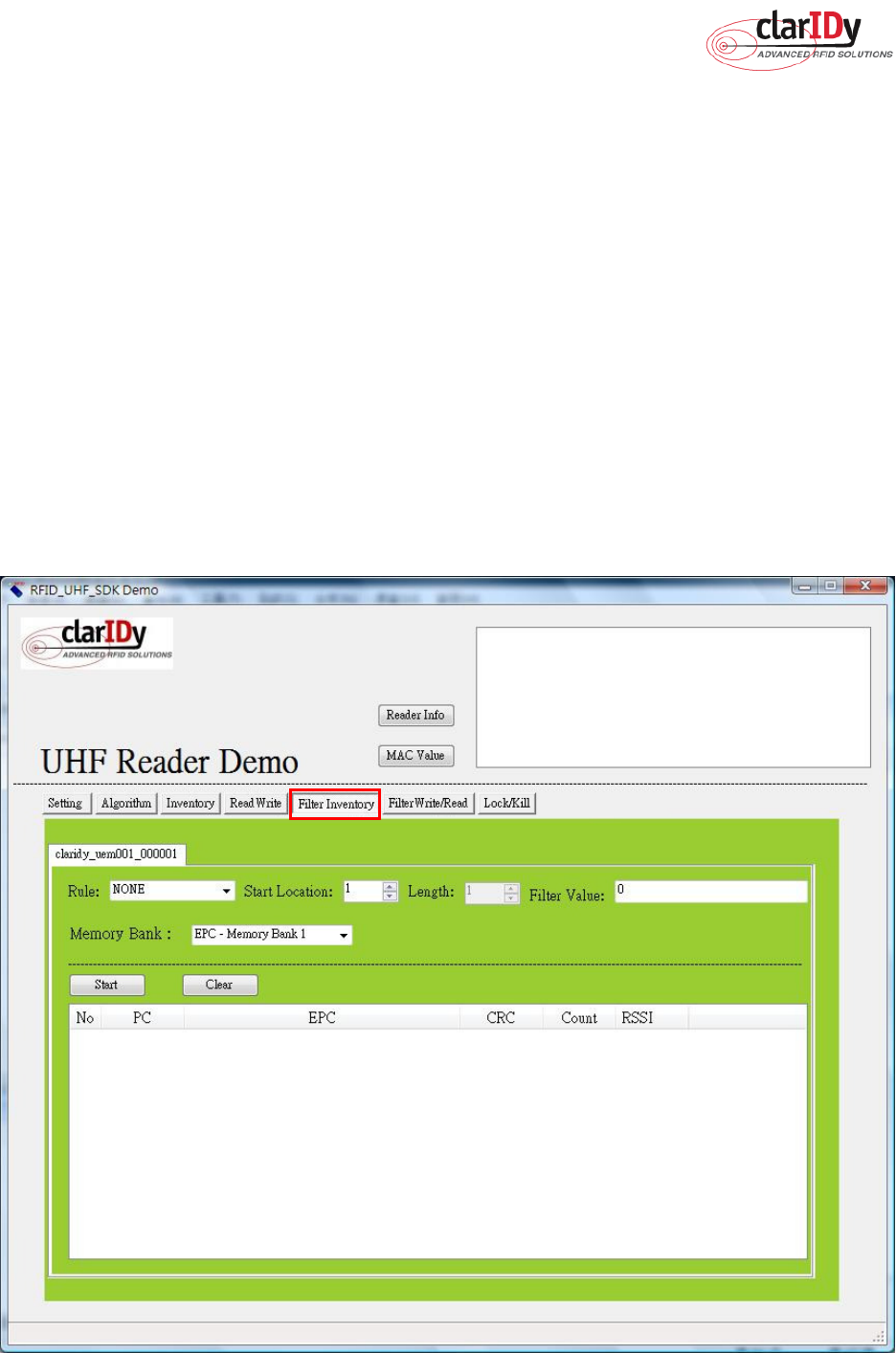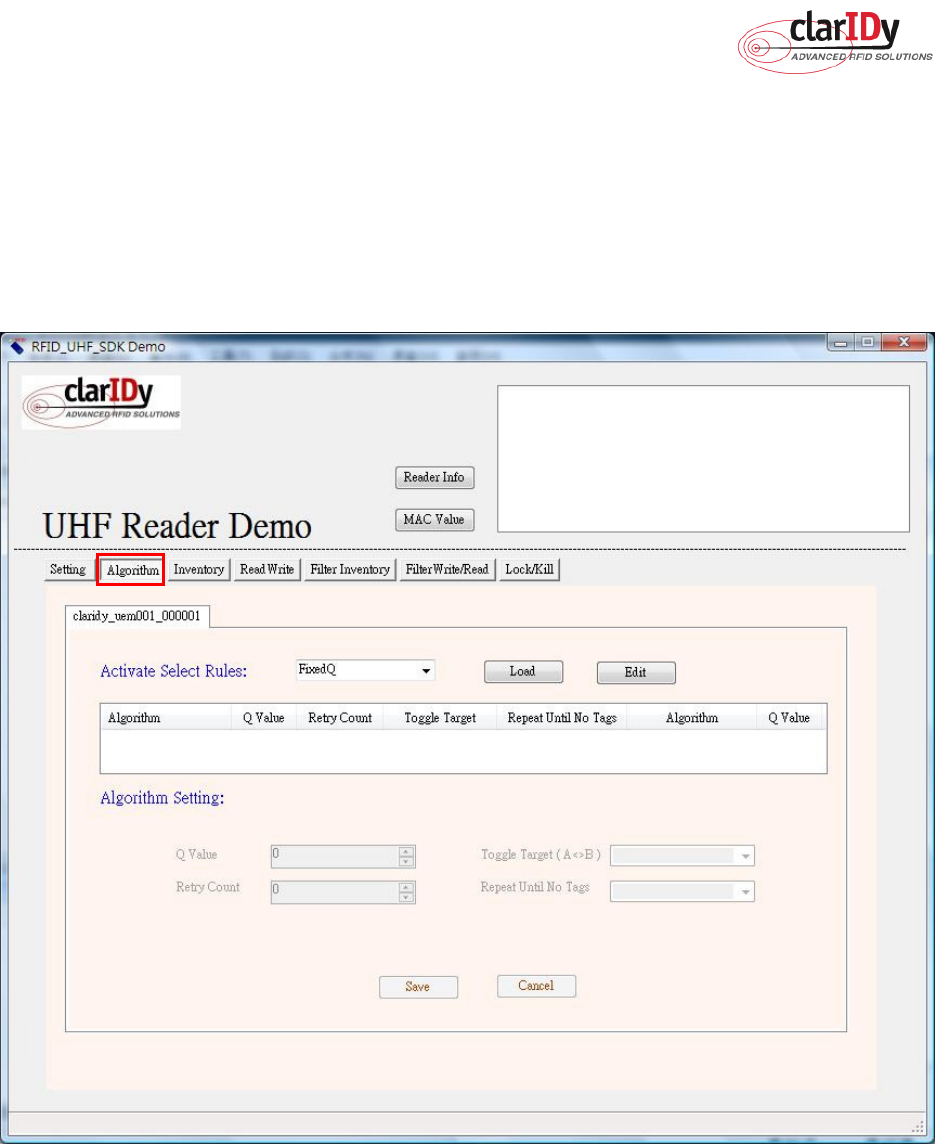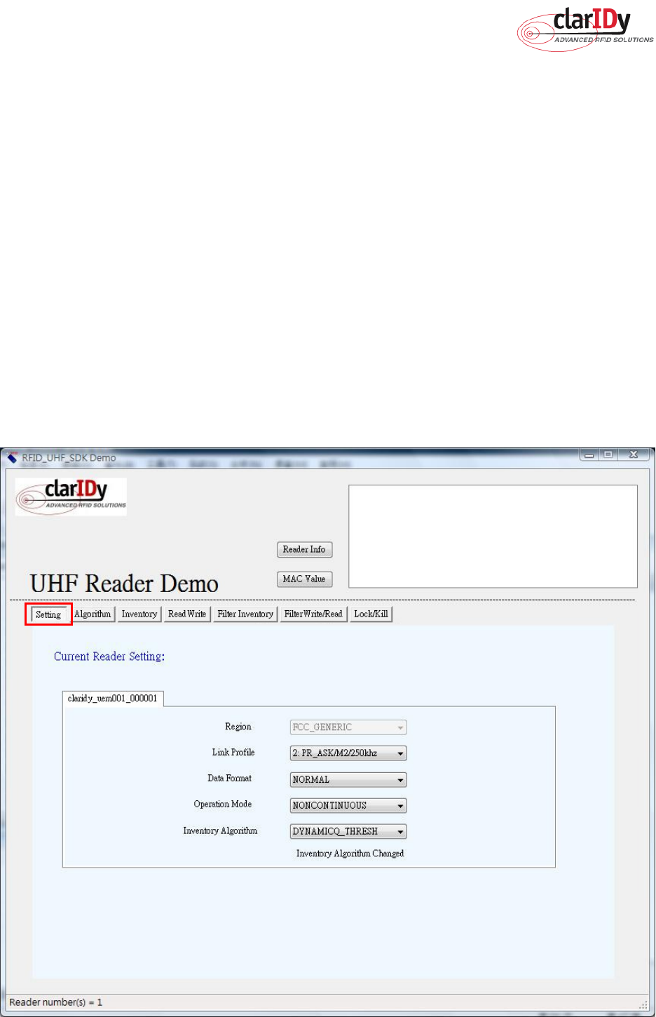 ClarIDy UHF RFID Reader. The demo program provides “Setting”, “Algorithm”, “Inventory”,