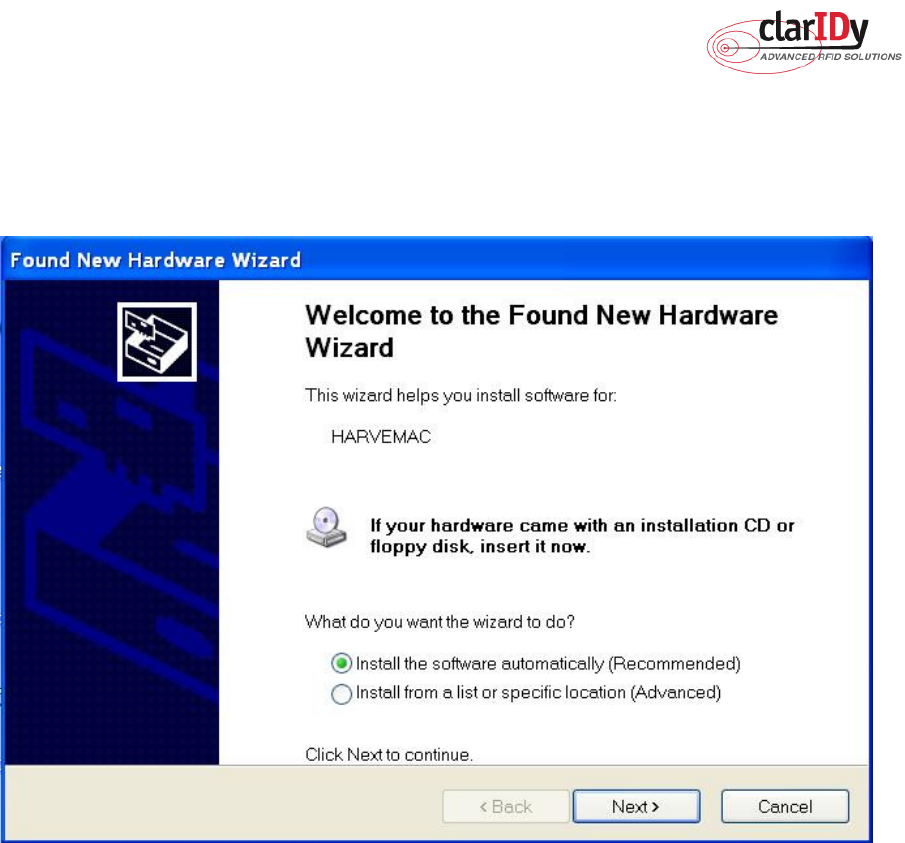 The Windows system will detect the ClarIDy UHF RFID Reader as a new device and popup