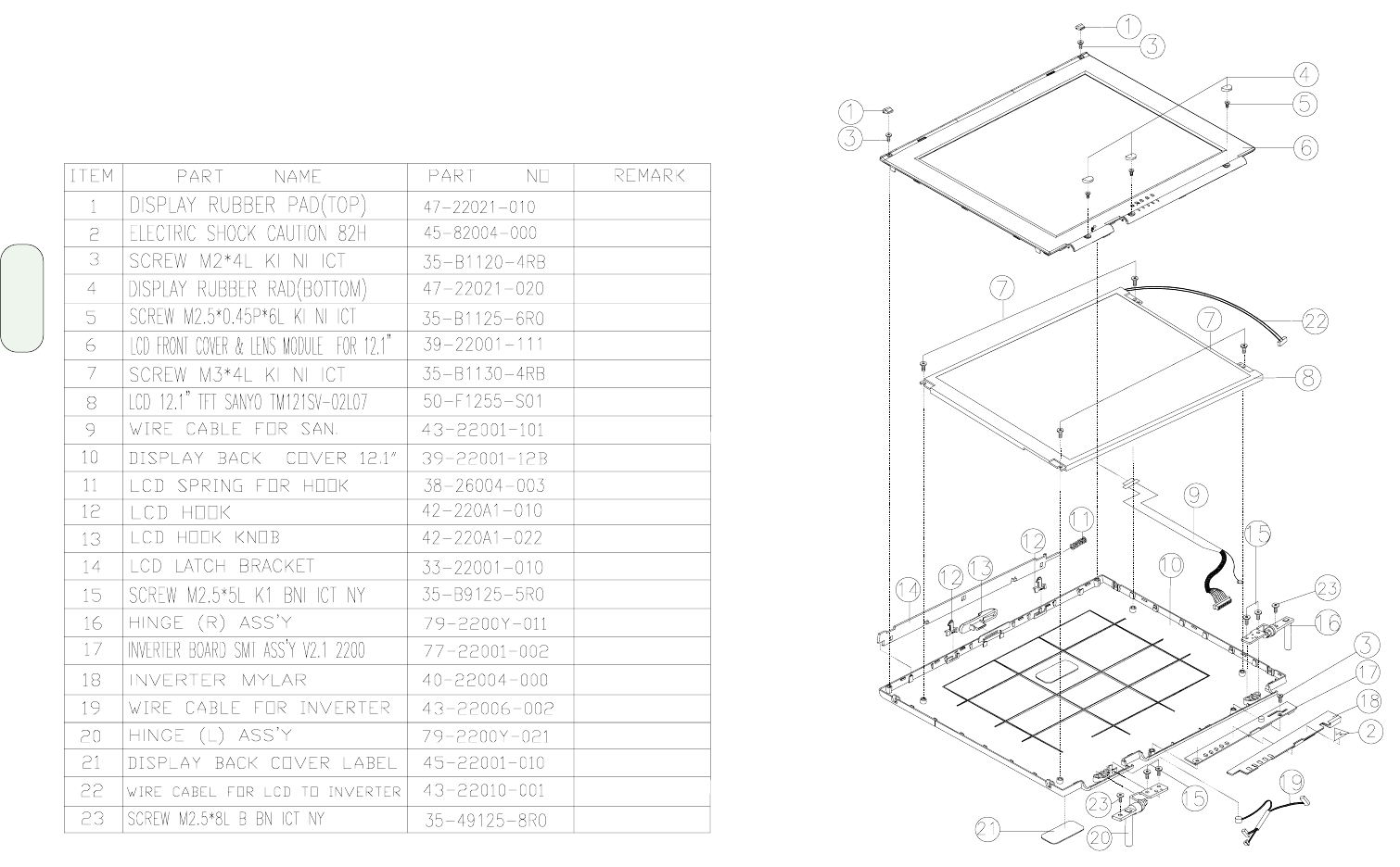 - LCD panel (12.1") assembly and parts list