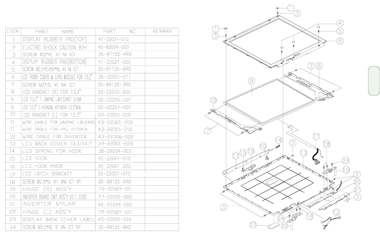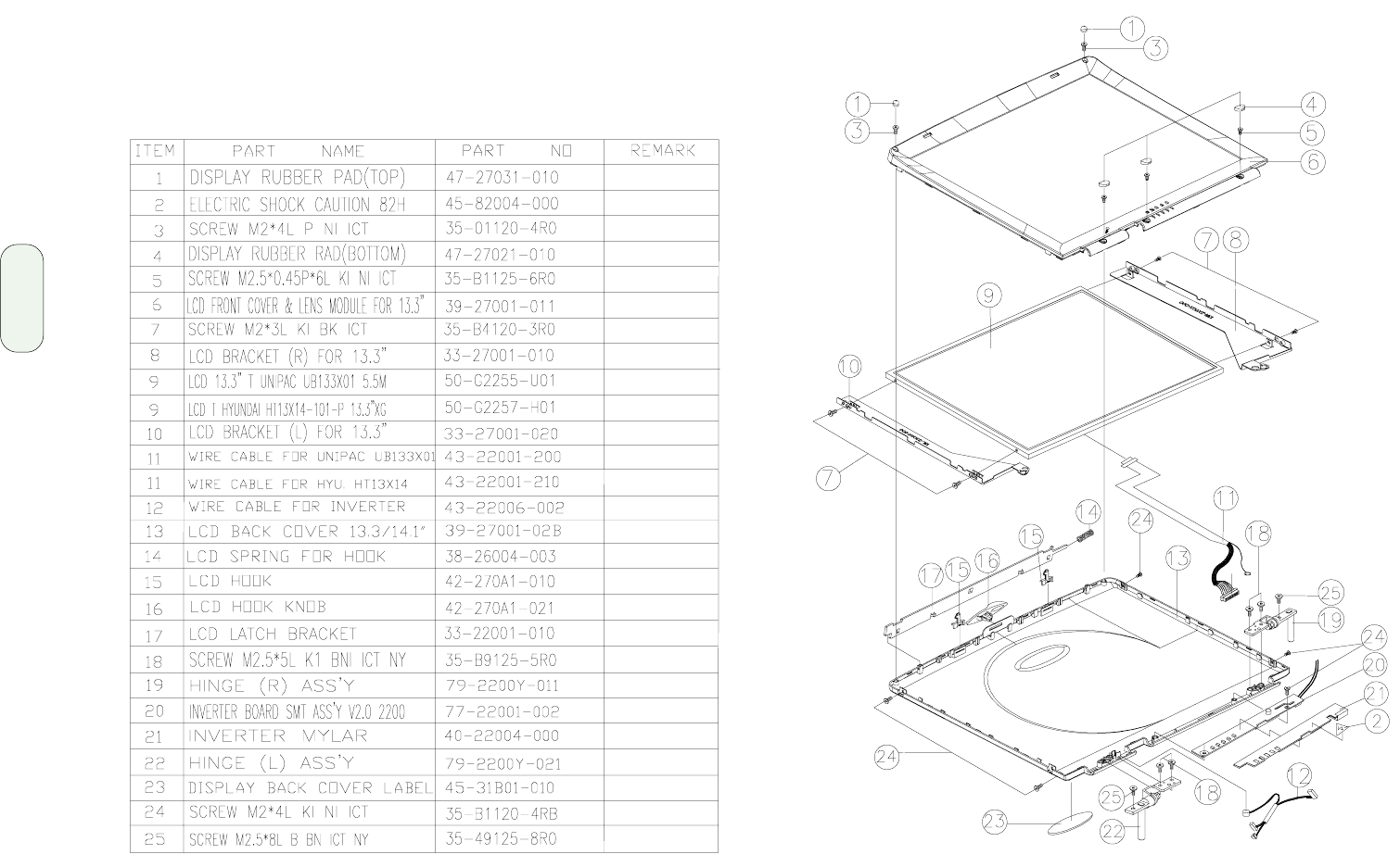 - LCD panel (13.3") assembly and parts list