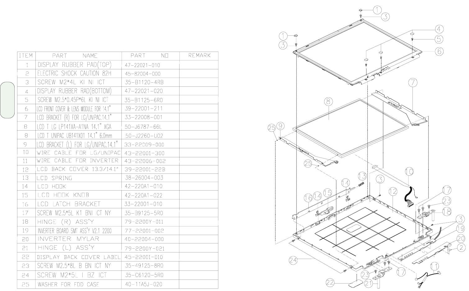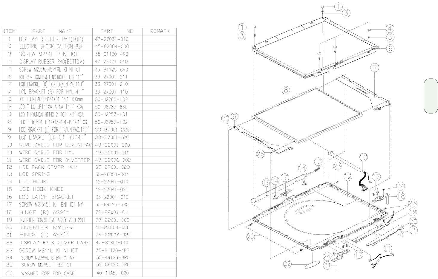 - LCD panel (14.1") assembly and parts list