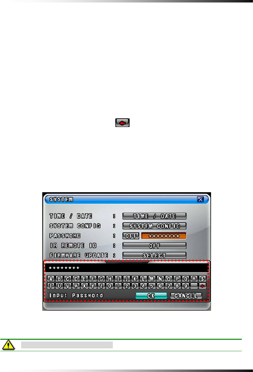 Check Password at MENU → SETUP → SYSTEM → PASSWORD