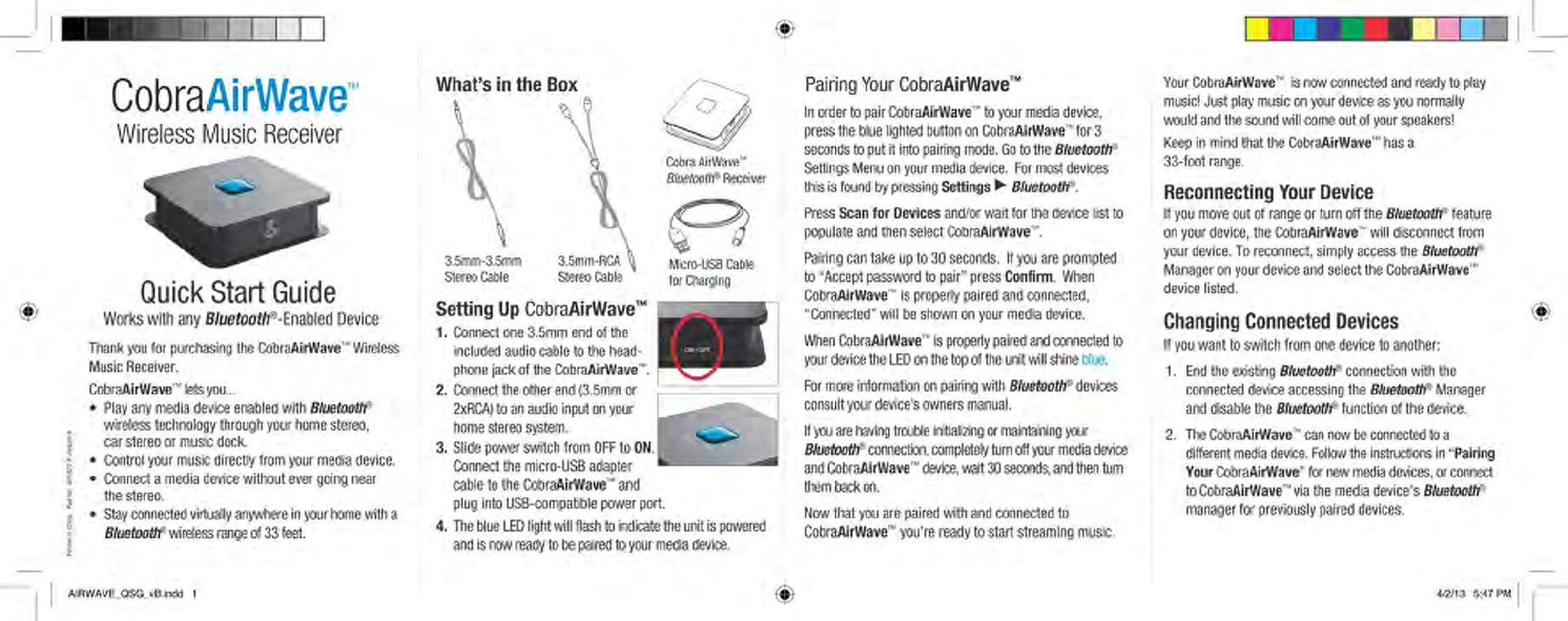 Cobra Electronics AIR1A Bluetooth music streaming receiving device User Manual