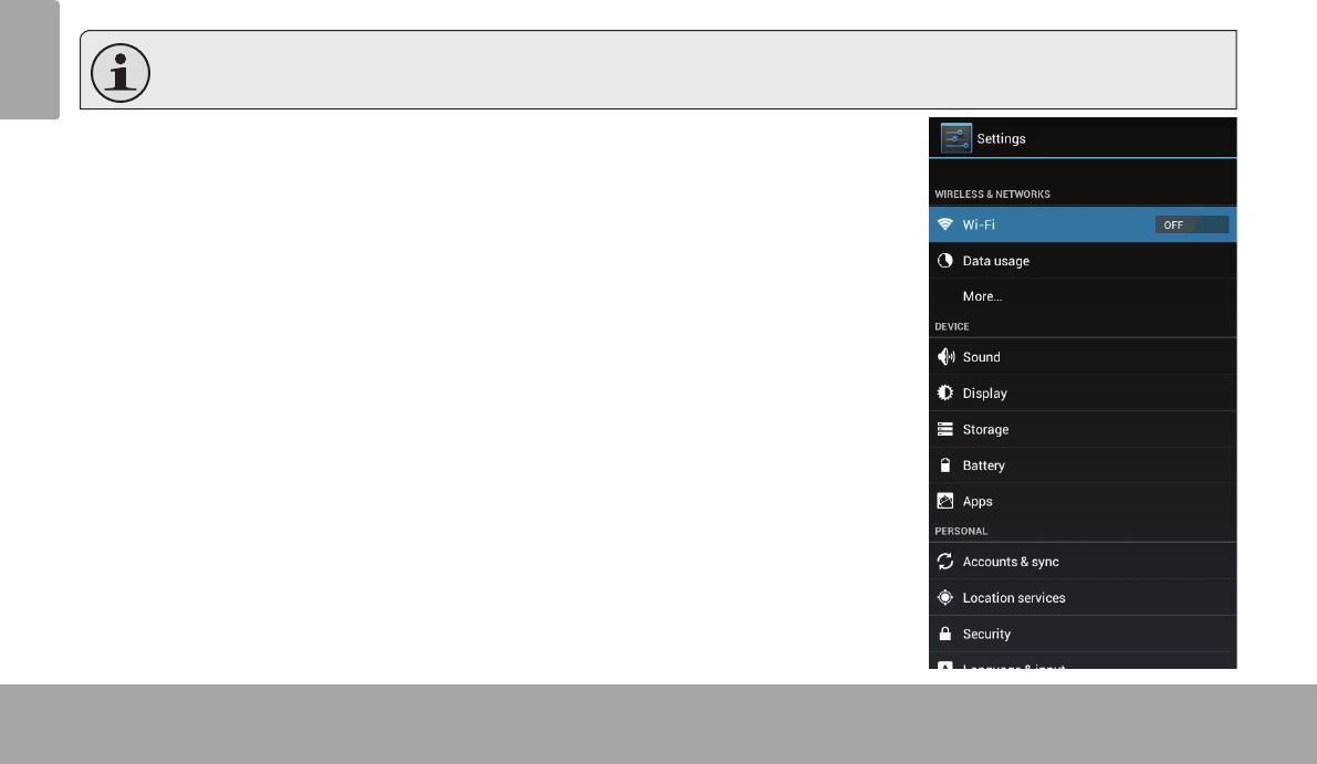 The settings are grouped by category. Touch a category to open and adjust its set-