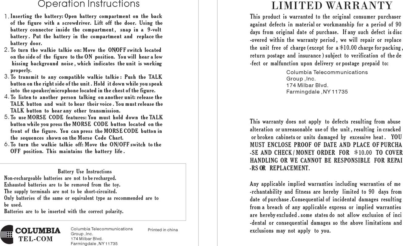 Columbia Telecommunications Group Inc Walkie Talkie R0207184Mnl