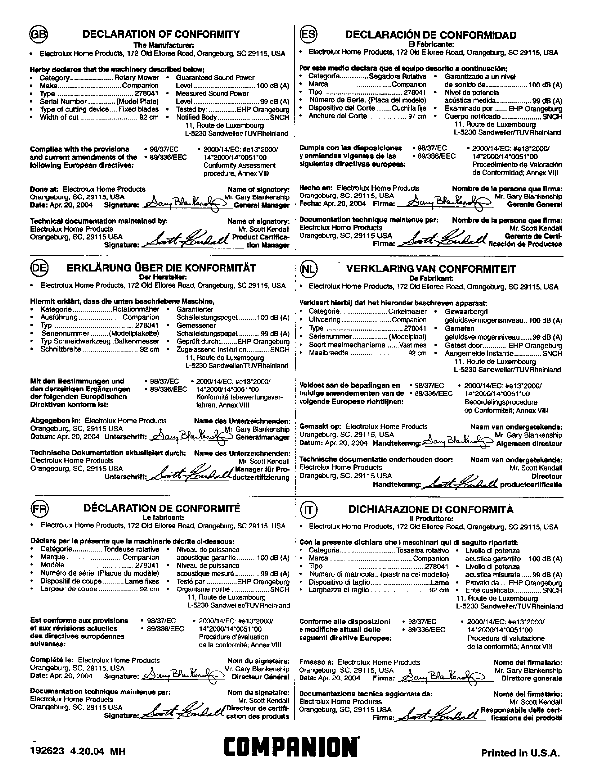 Emesso a: Electrolux Home Products Nome del flrmatario: