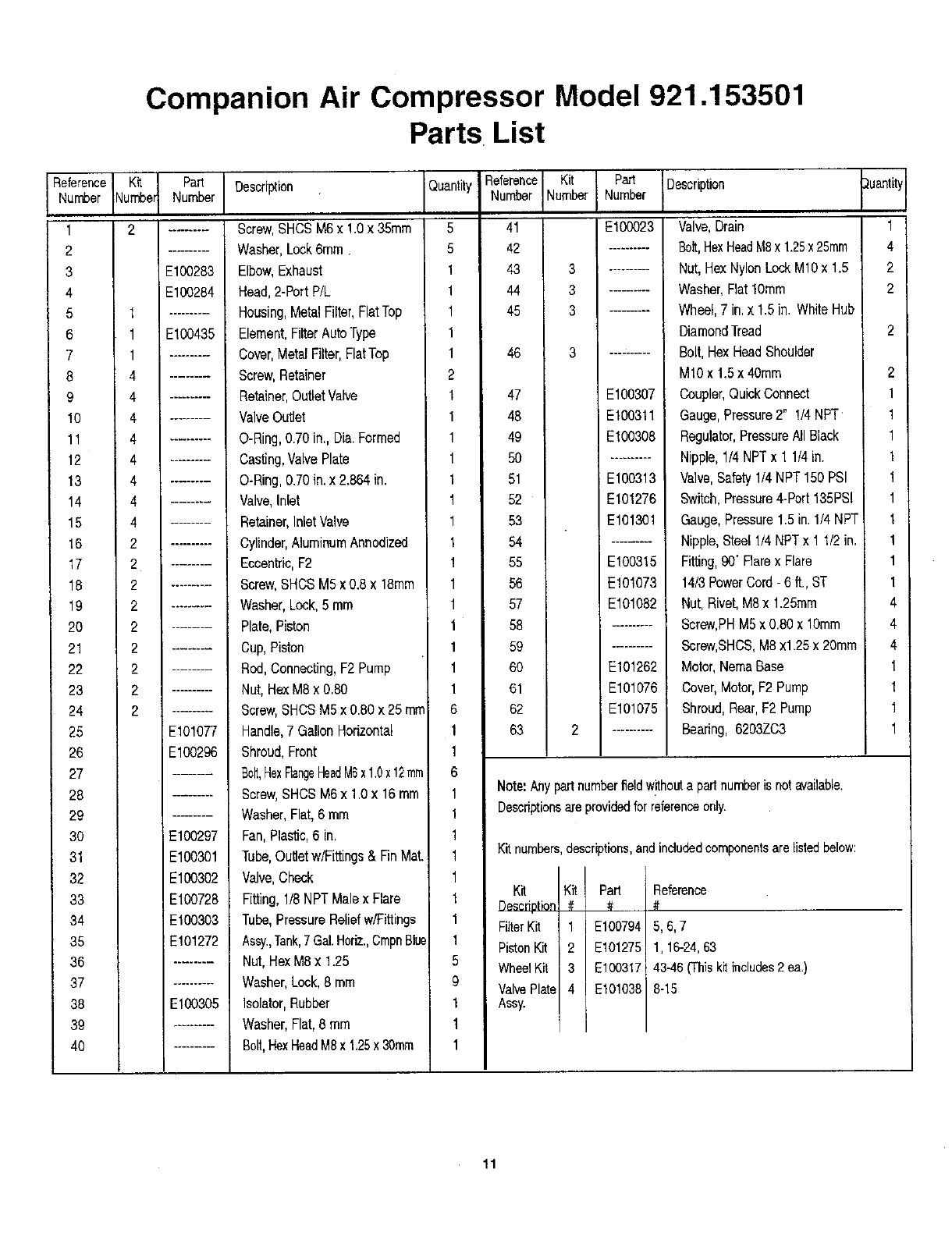 User Manual: Companion 921153501 921153501 COMPANION AIR COMPRESSOR - Manuals and Guides View the owners manual for your COMPANION AIR COMPRESSOR #921153501. Home:Tool Parts:Companion Parts:Companion AIR COMPRESSOR Manual