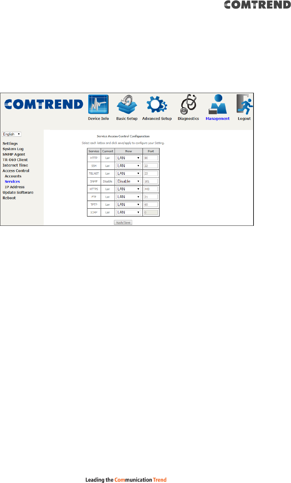 The Services option limits or opens the access services over the LAN or WAN.    The