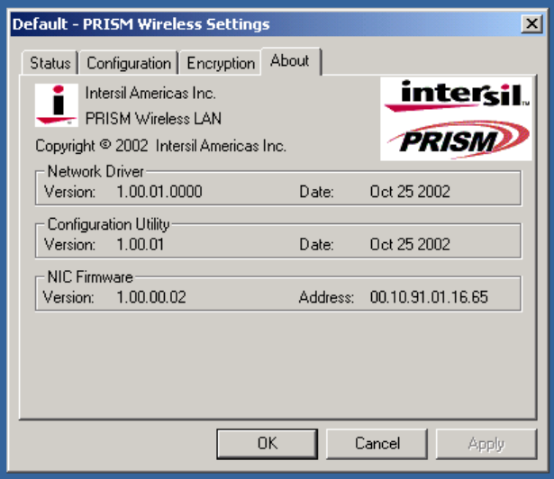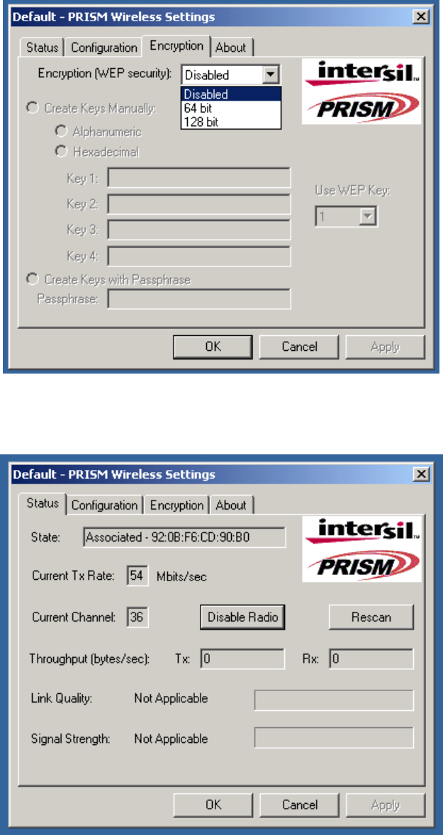 e-double click the Intersil WLAN icon to open the WLAN settings, the following window will appear