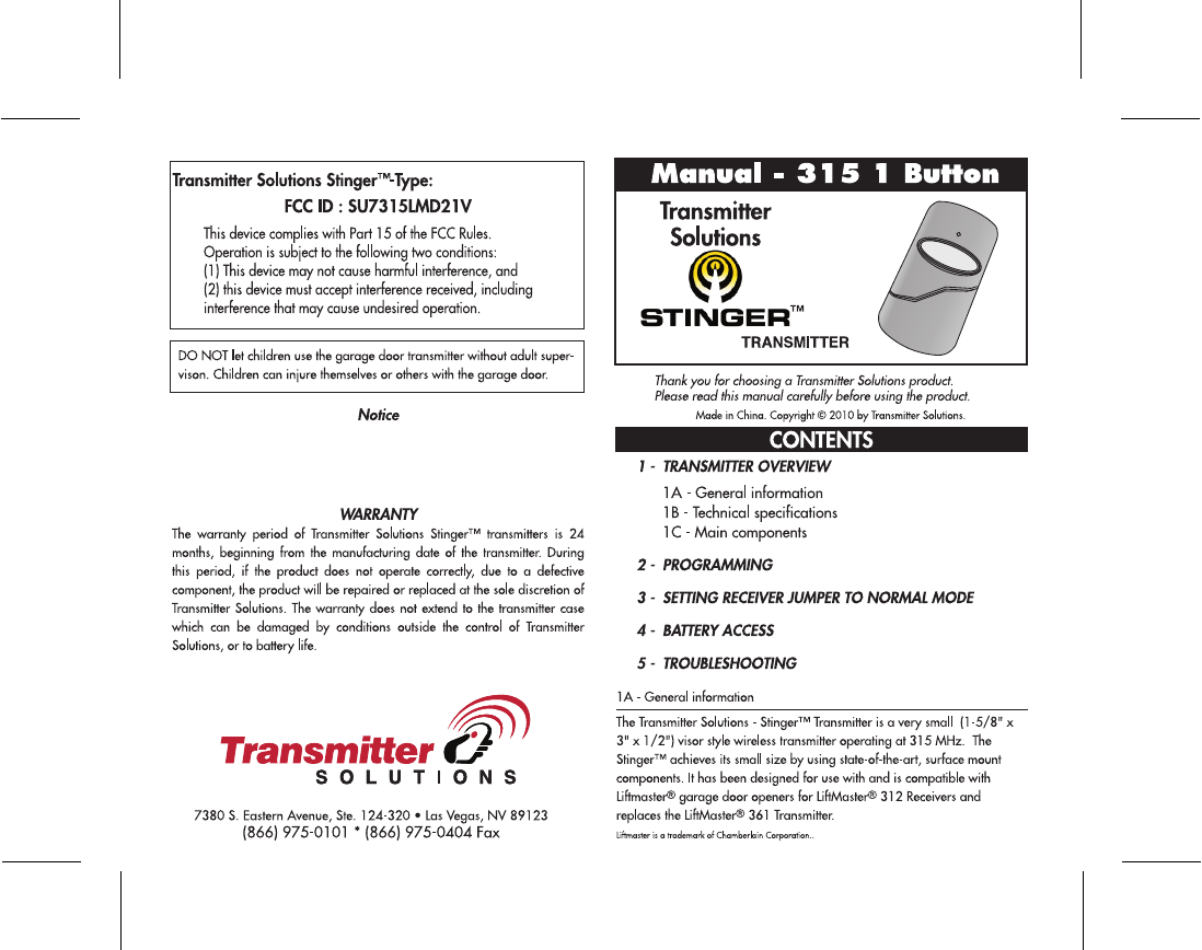 expressly approved by Transmitter Solutions could void the manufacturer’s
