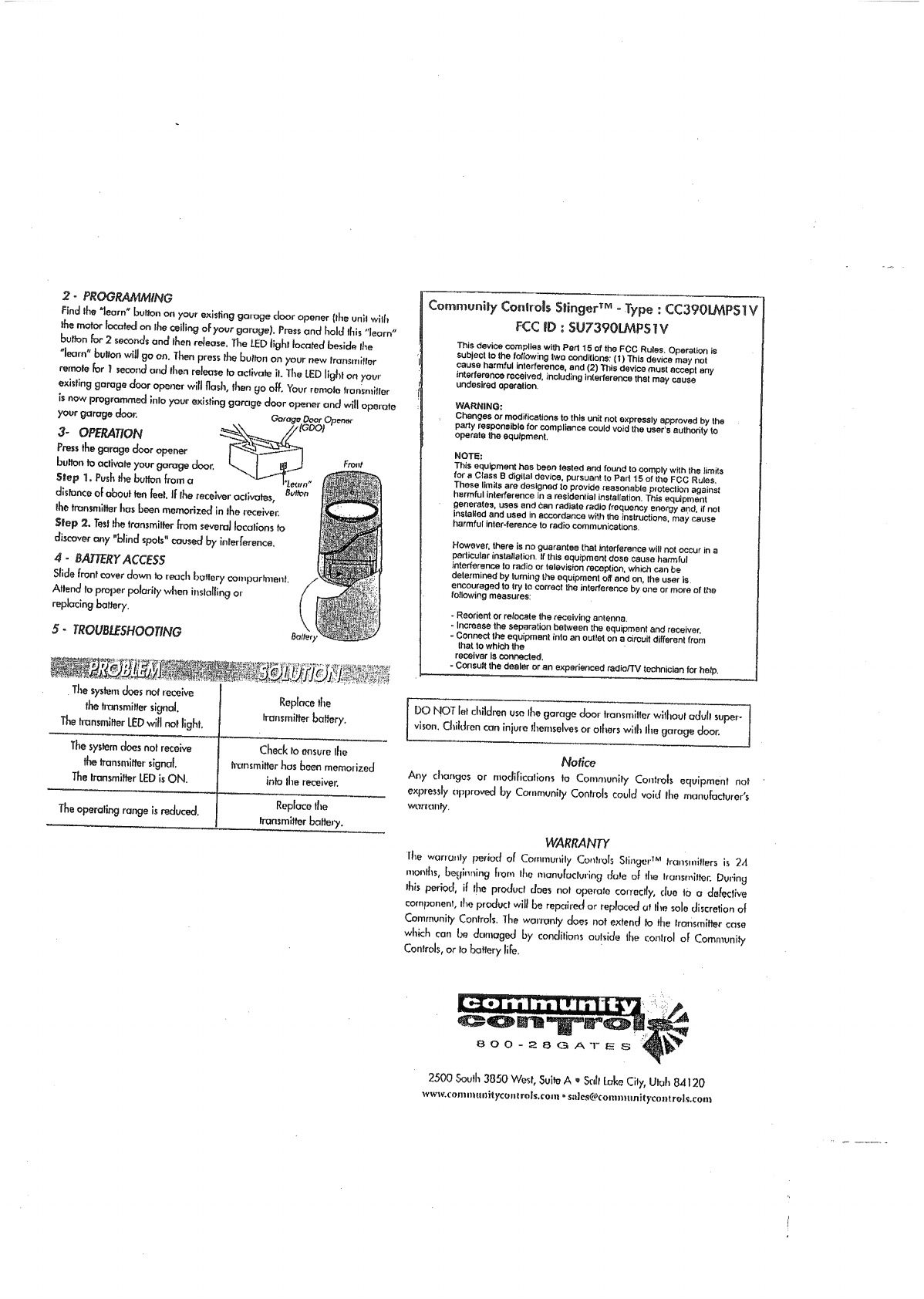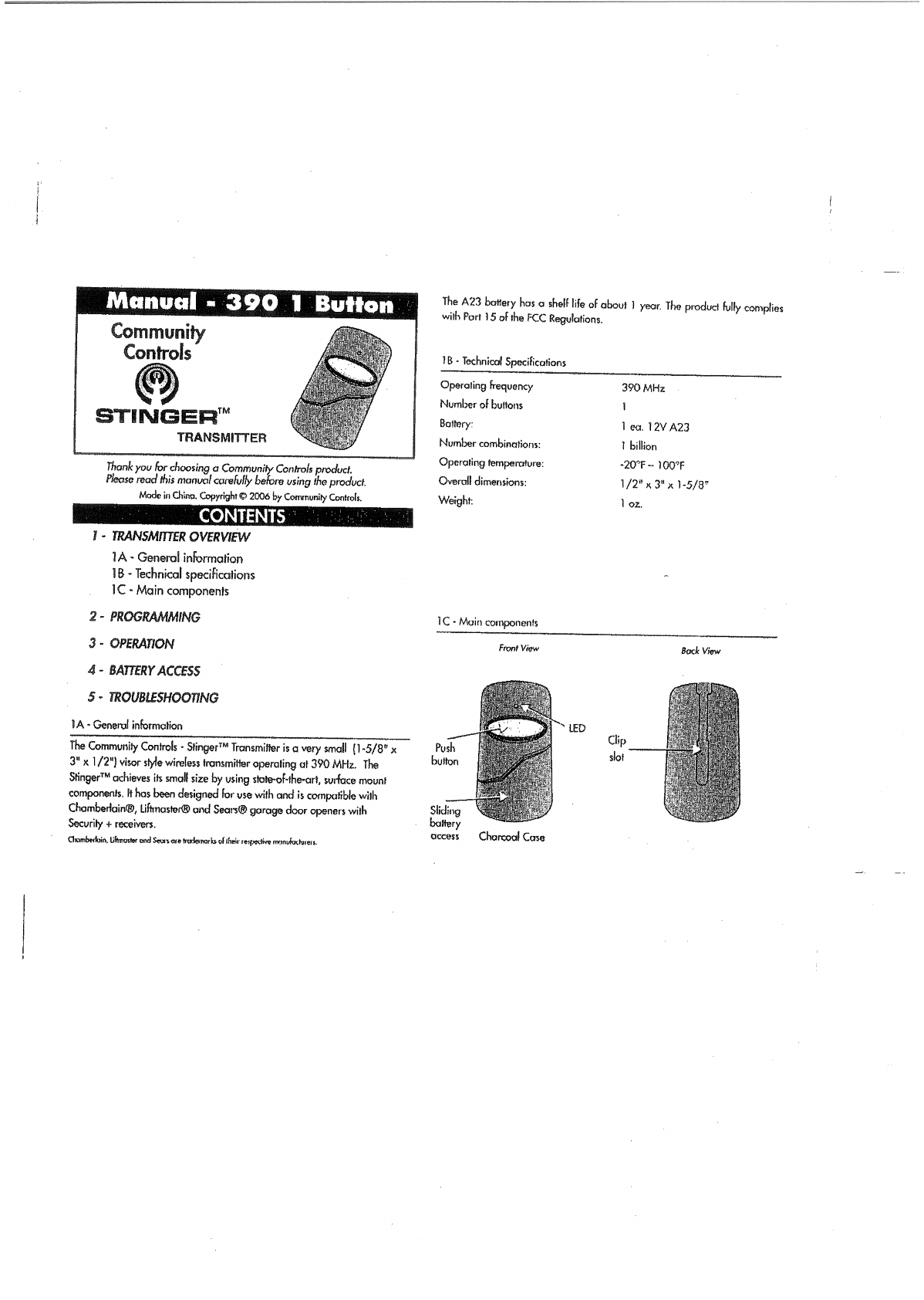 Controlled Entry Distributors 390LMPS1V Remote Transmitter (390MHz Tx) User Manual