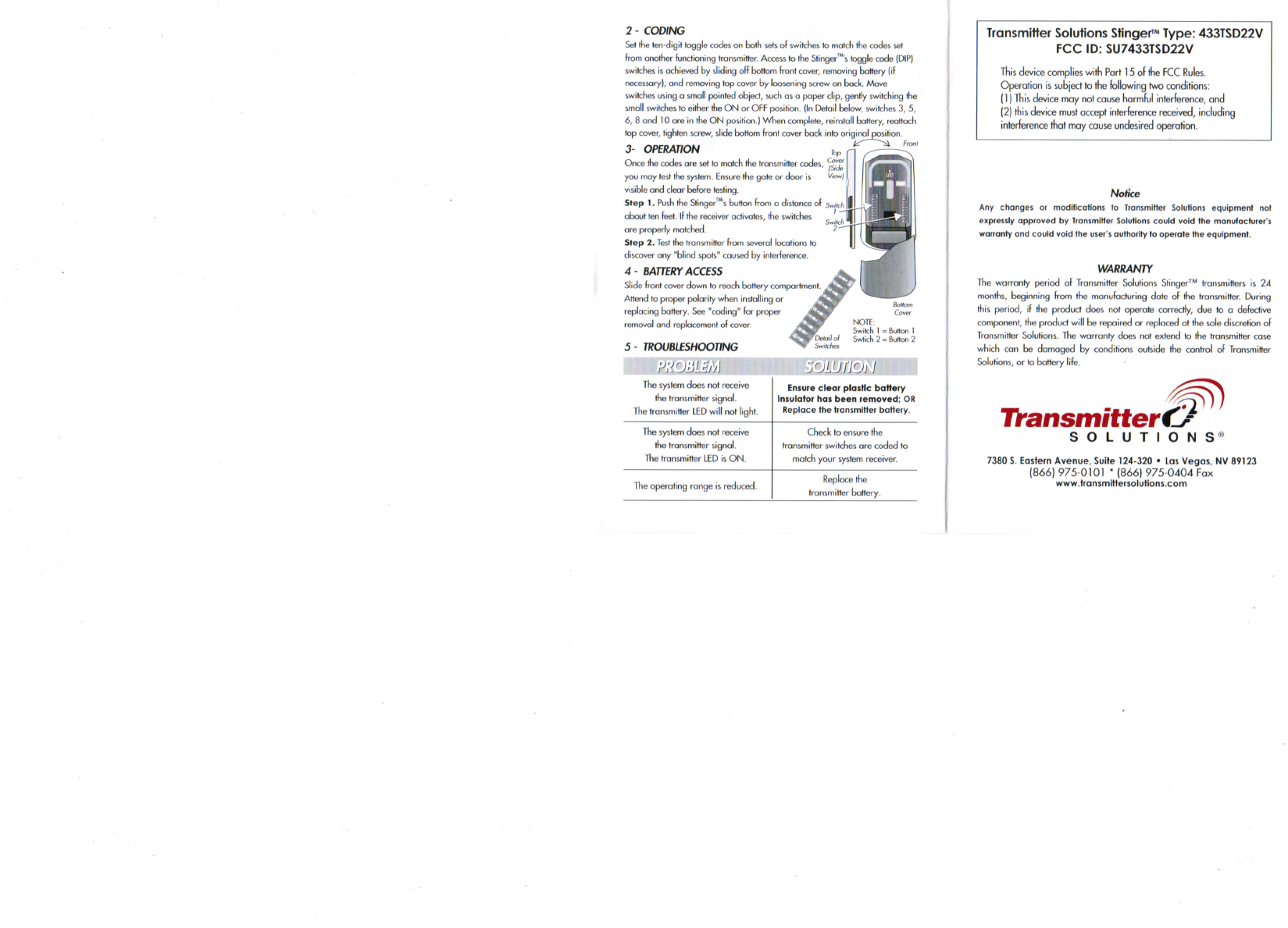 Controlled Entry Distributors 433TSD22V Remote Controller User Manual