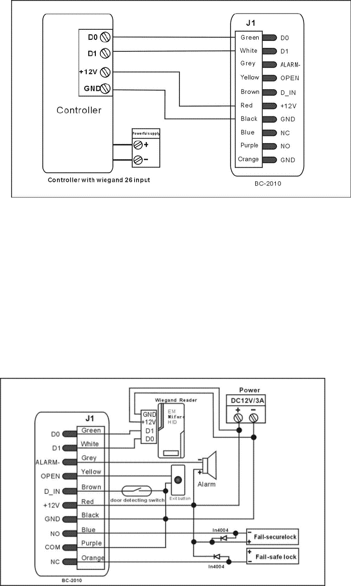 with a 26 bit output can be connected to the Wiegand input terminals on the BC-2010. Either