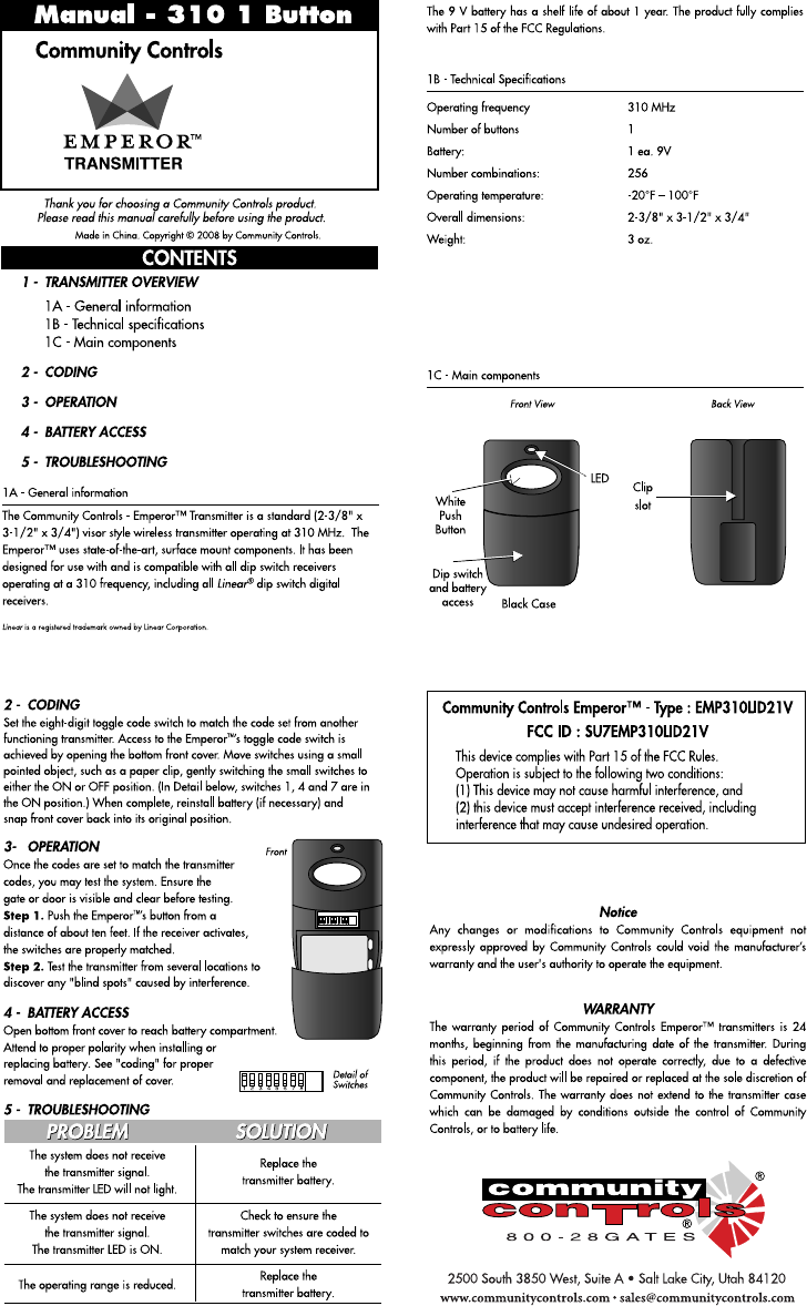 Controlled Entry Distributors EMP310LID21V Community Controls Emperor User Manual CC Emperor 310 1B R2