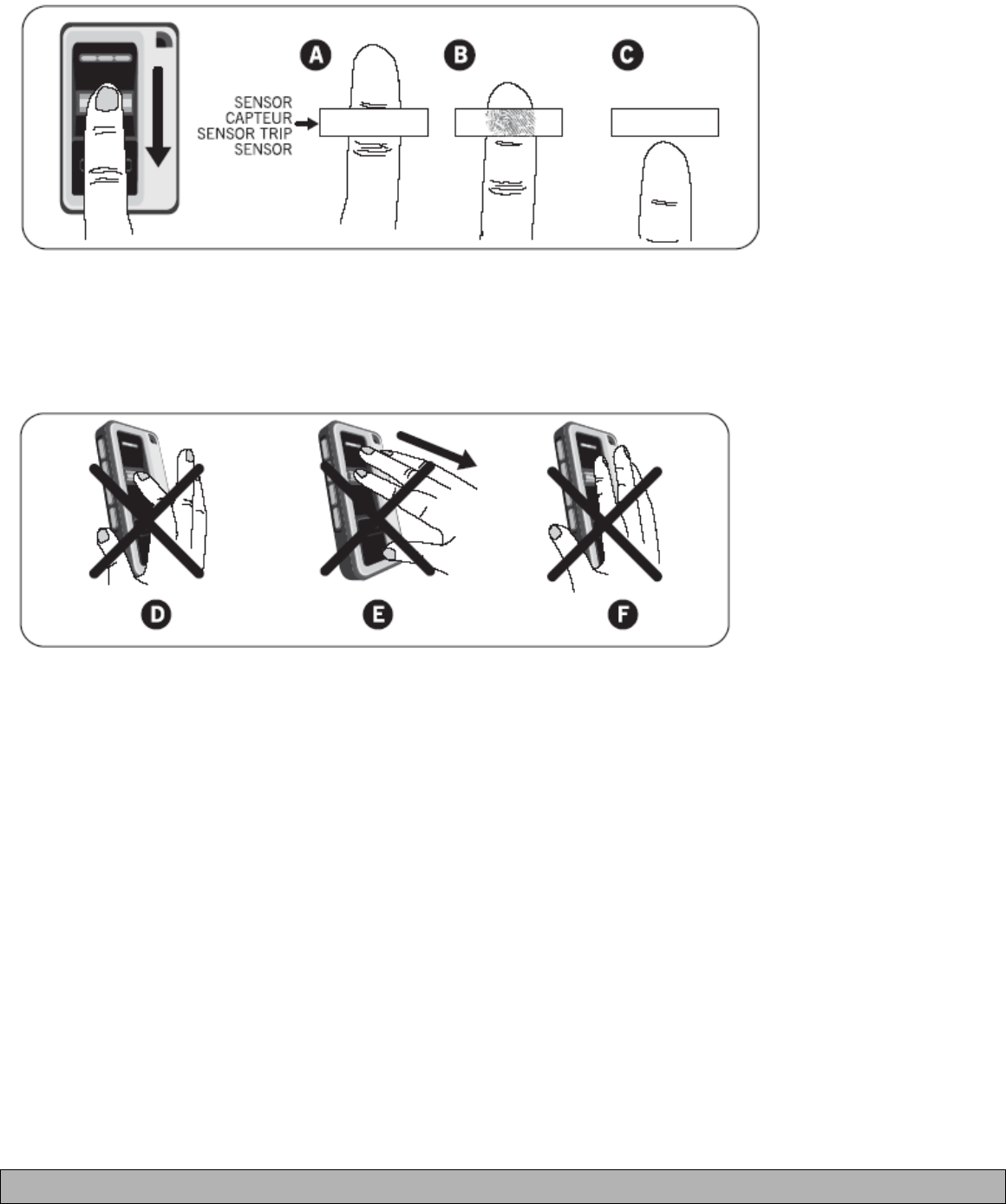 D: Do not bend finger during swipe as this will only scan the tip of your finger.