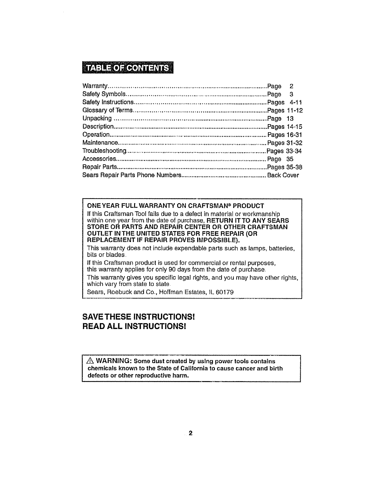 Sears Repair Parts Phone Numbers ................................................. Back Cover