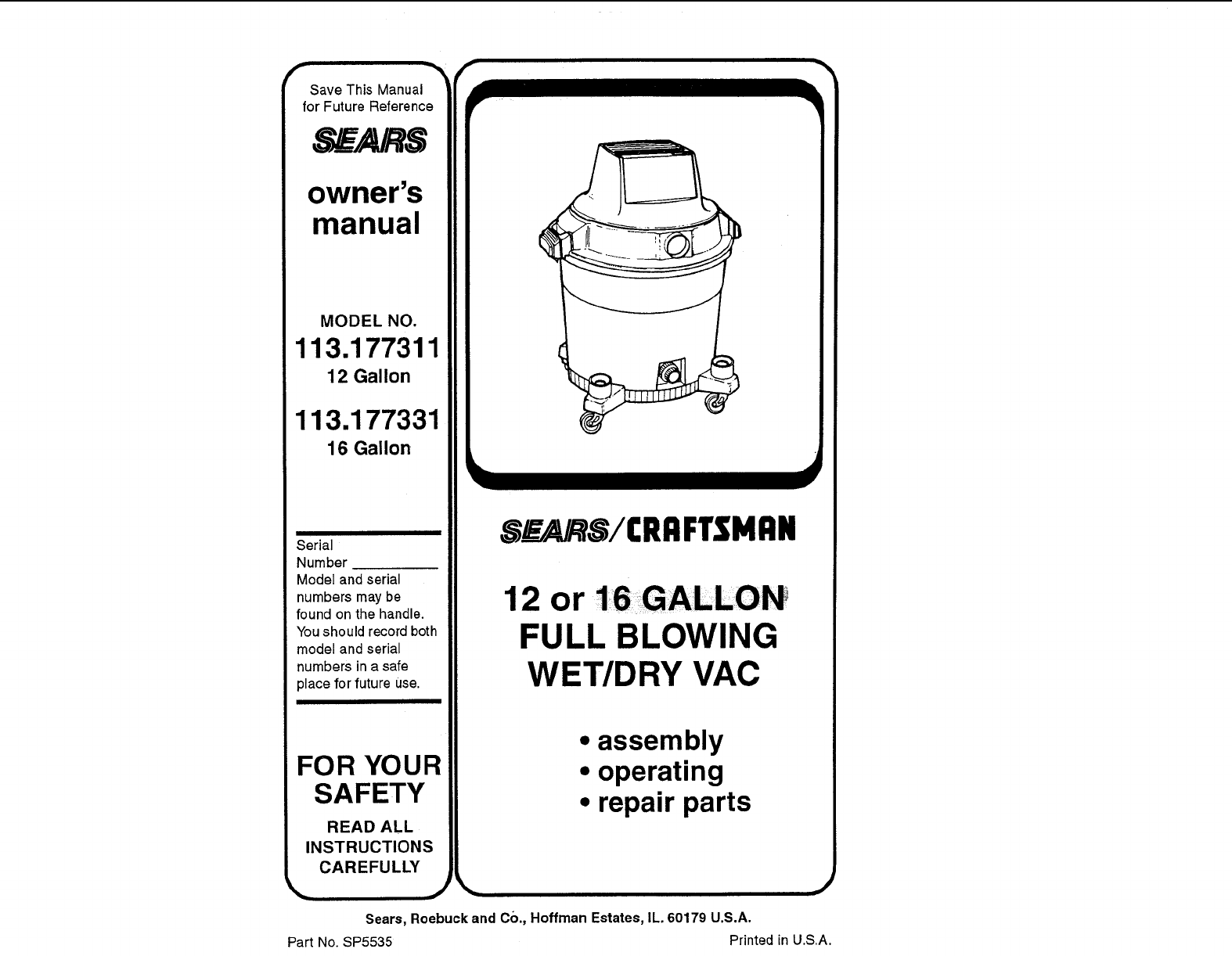 User Manual: Craftsman 113177311 113177311 CRAFTSMAN WET/DRY VAC - Manuals and Guides View the owners manual for your CRAFTSMAN WET/DRY VAC #113177311. Home:Vacuums & Floor Care Parts:Craftsman Parts:Craftsman WET/DRY VAC Manual