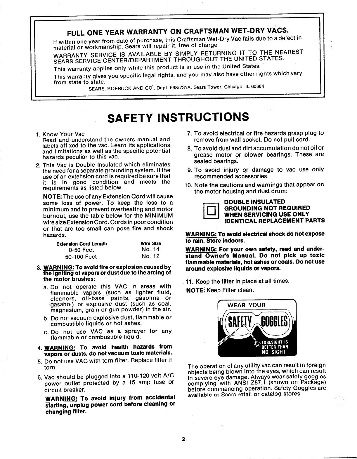 Craftsman 113178060 User Manual WET DRY VAC Manuals And Guides L0904583