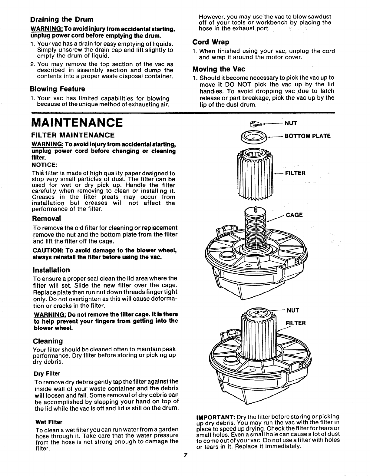 5. Do not use VAC with torn filter. Replace filter if