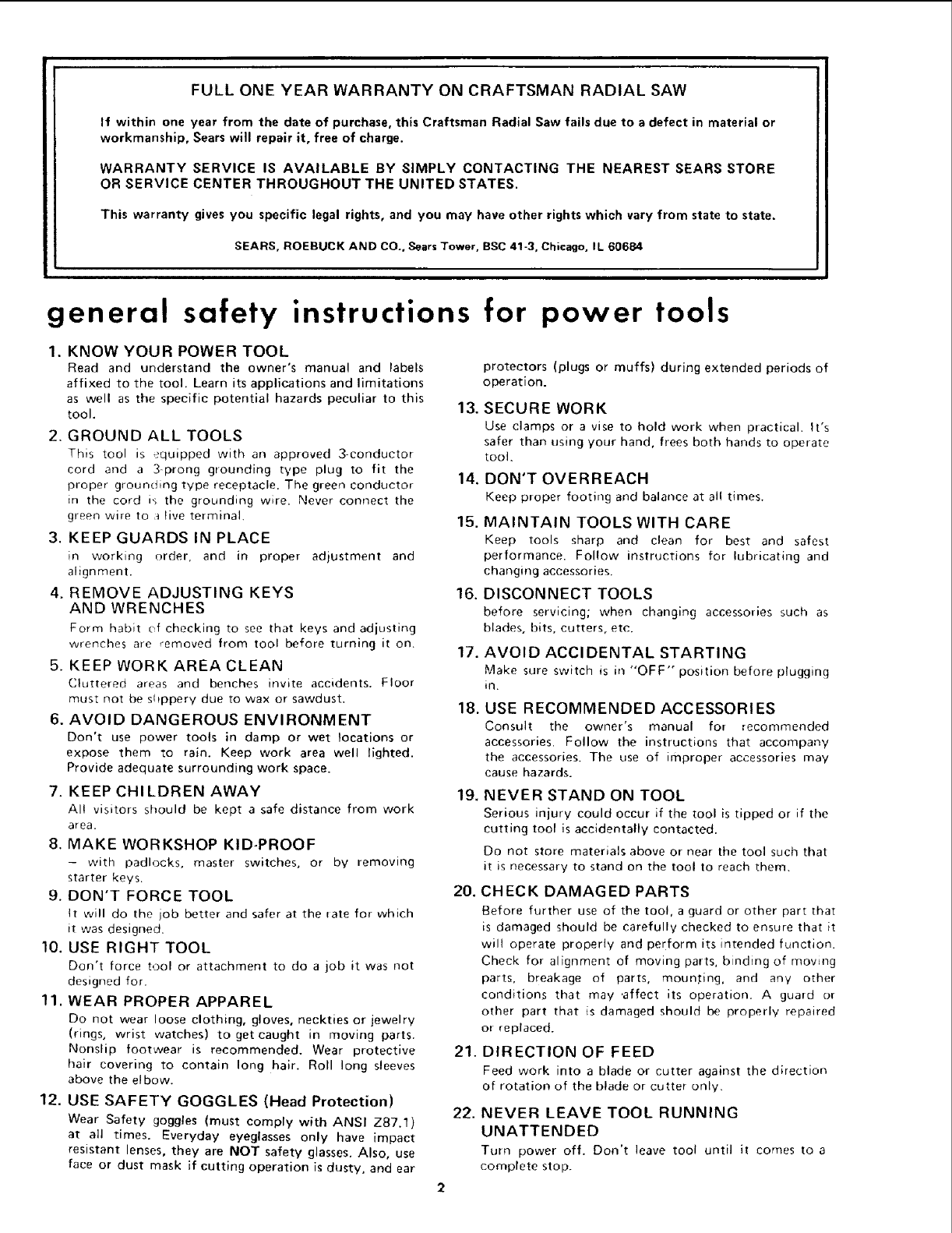 FULL ONE YEAR WARRANTY ON CRAFTSMAN RADIAL SAW