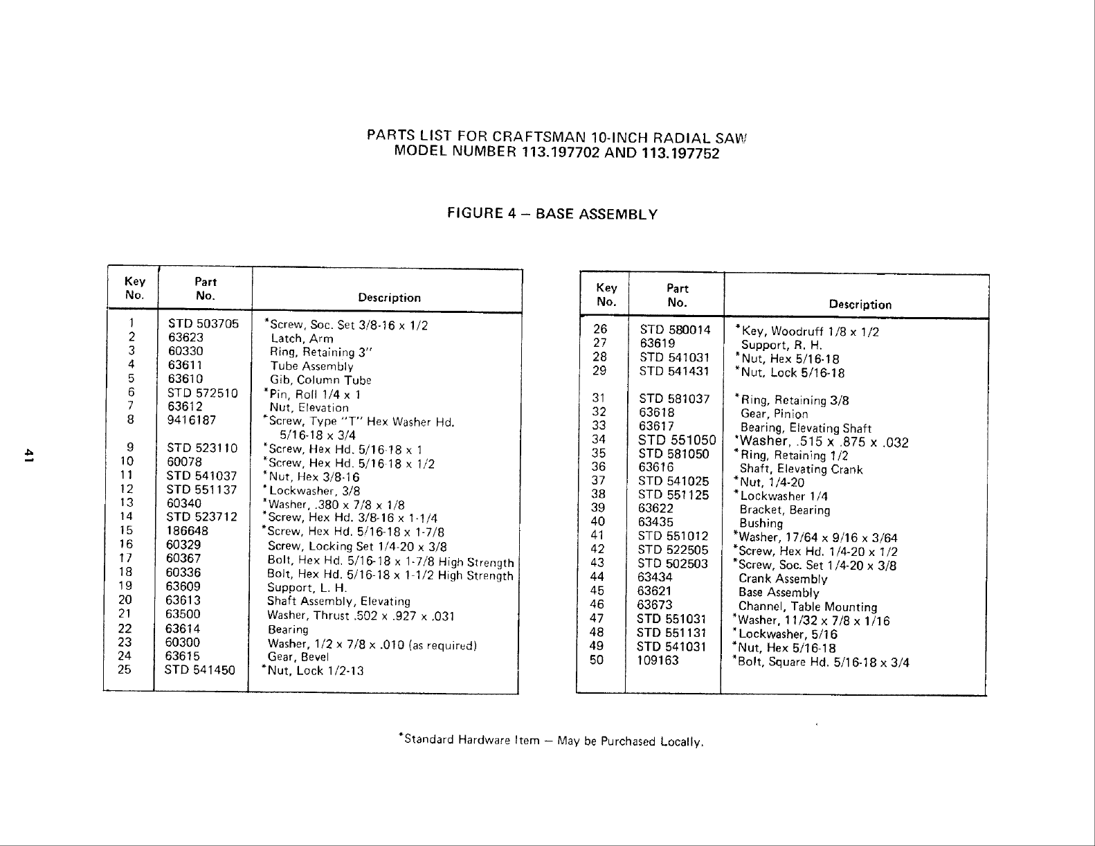 *Standard Hardware Item May be Purchased Locally.