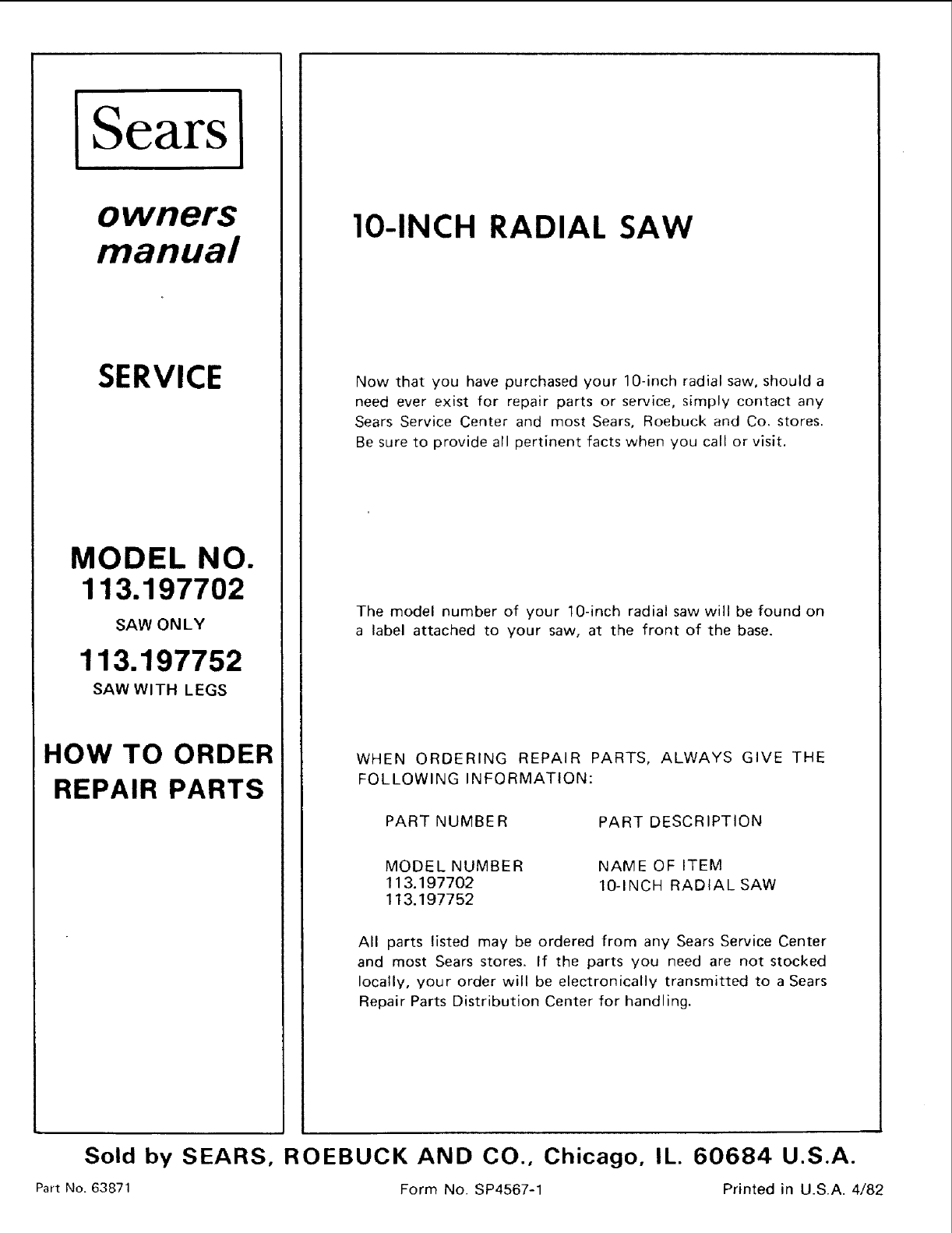 Part No. 63871 Form No. SP4567-1 Printed in U.S.A. 4/82