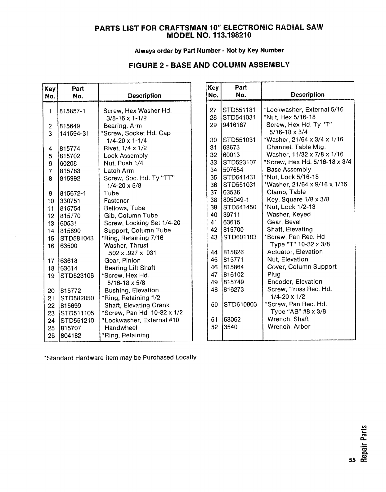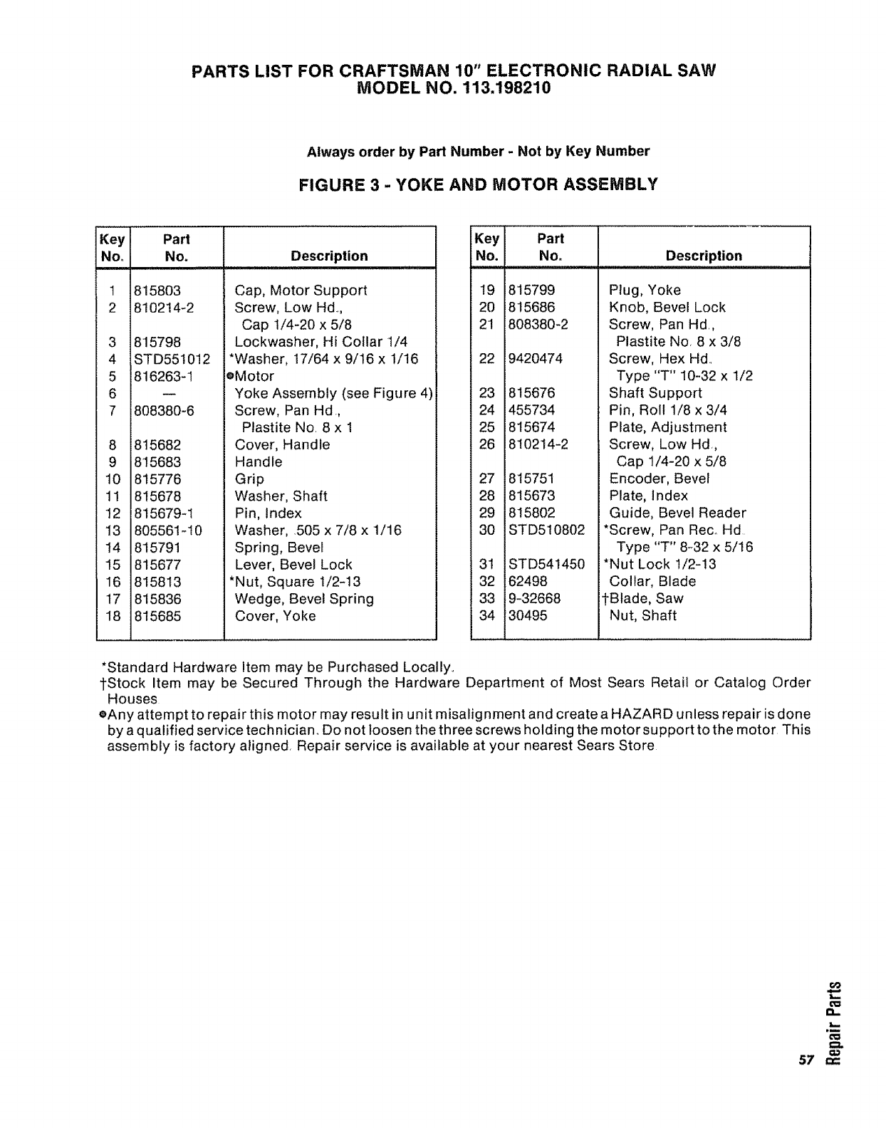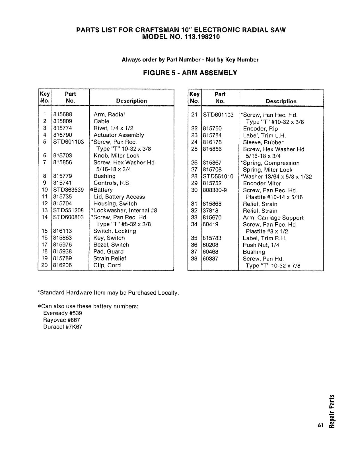 PARTS LiST FOR CRAFTSMAN 10" ELECTRONIC RADIAL SAW