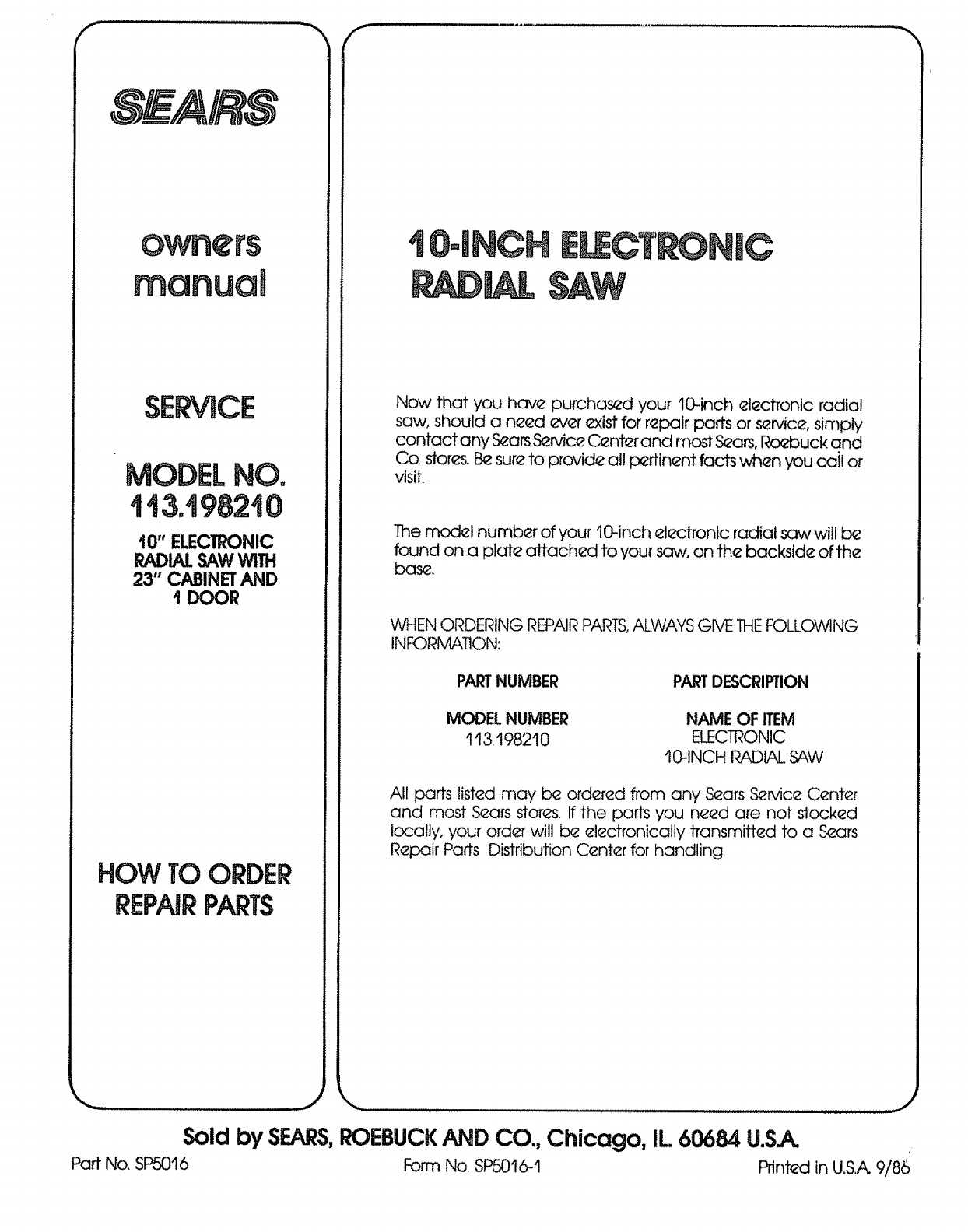 User Manual: Craftsman 113198210 113198210 CRAFTSMAN CRAFTSMAN 10 IN. ELECTRONIC RADIAL SAW - Manuals and Guides View the owners manual for your CRAFTSMAN CRAFTSMAN 10 IN. ELECTRONIC RADIAL SAW #113198210. Home:Tool Parts:Craftsman Parts:Craftsman CRAFTSMAN 10 IN. ELECTRONIC RADIAL SAW Manual