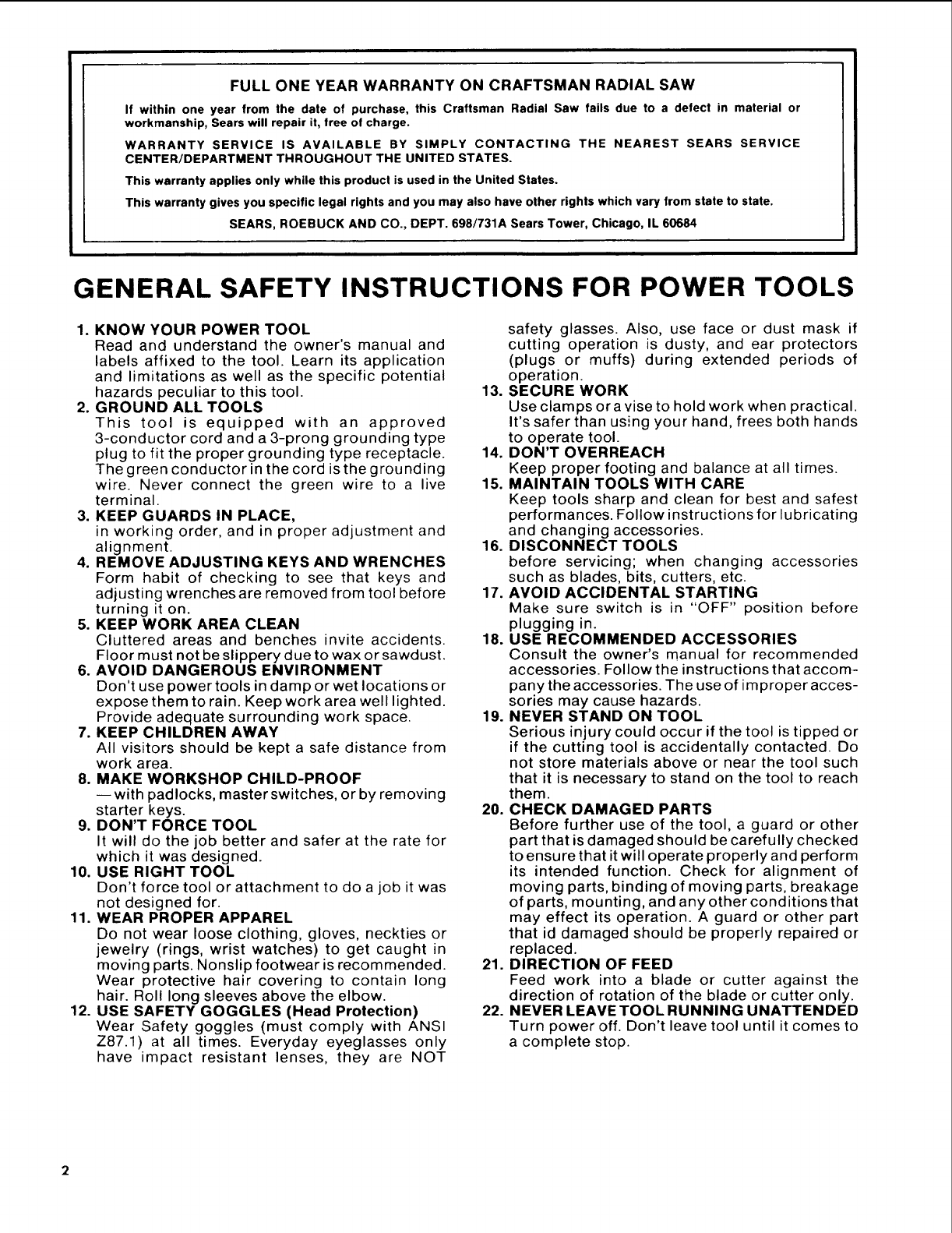 FULL ONE YEAR WARRANTY ON CRAFTSMAN RADIAL SAW