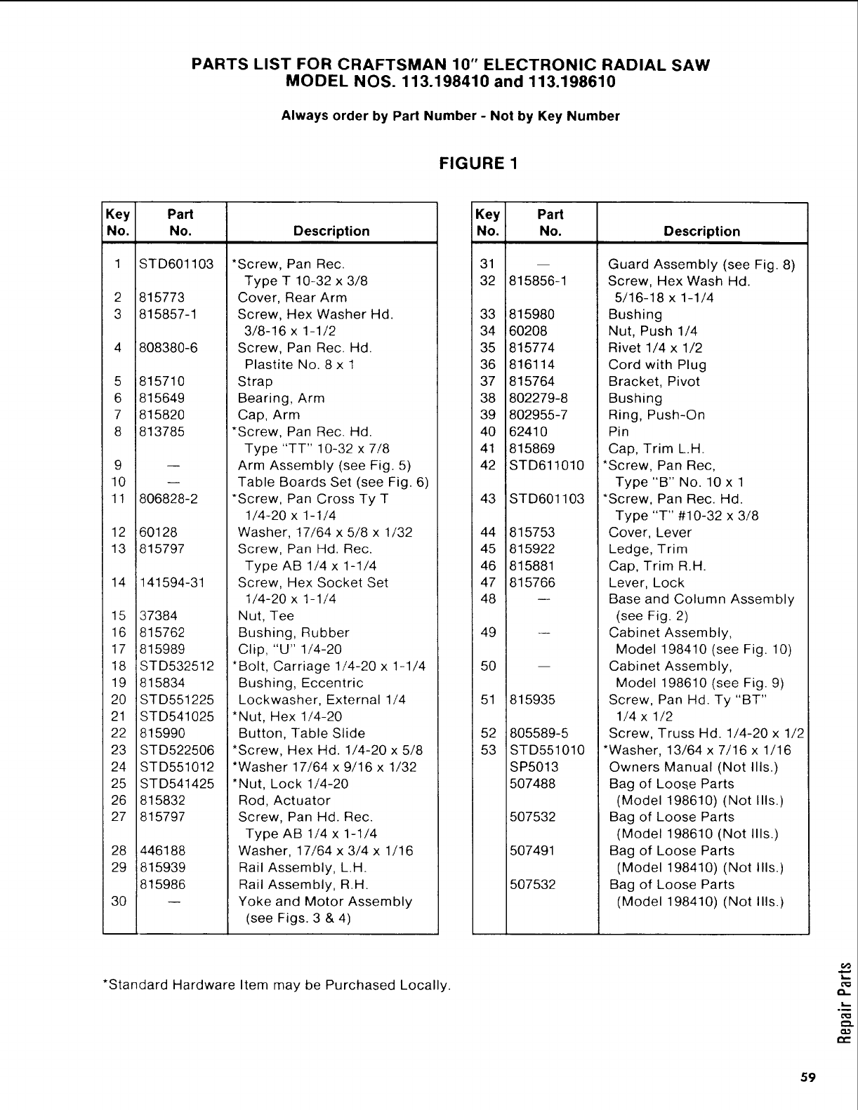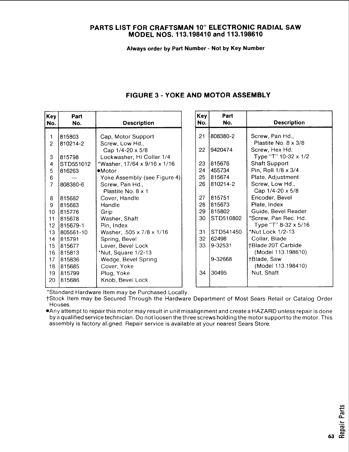 All parts listed may be ordered from any Scars Scn/ice Center