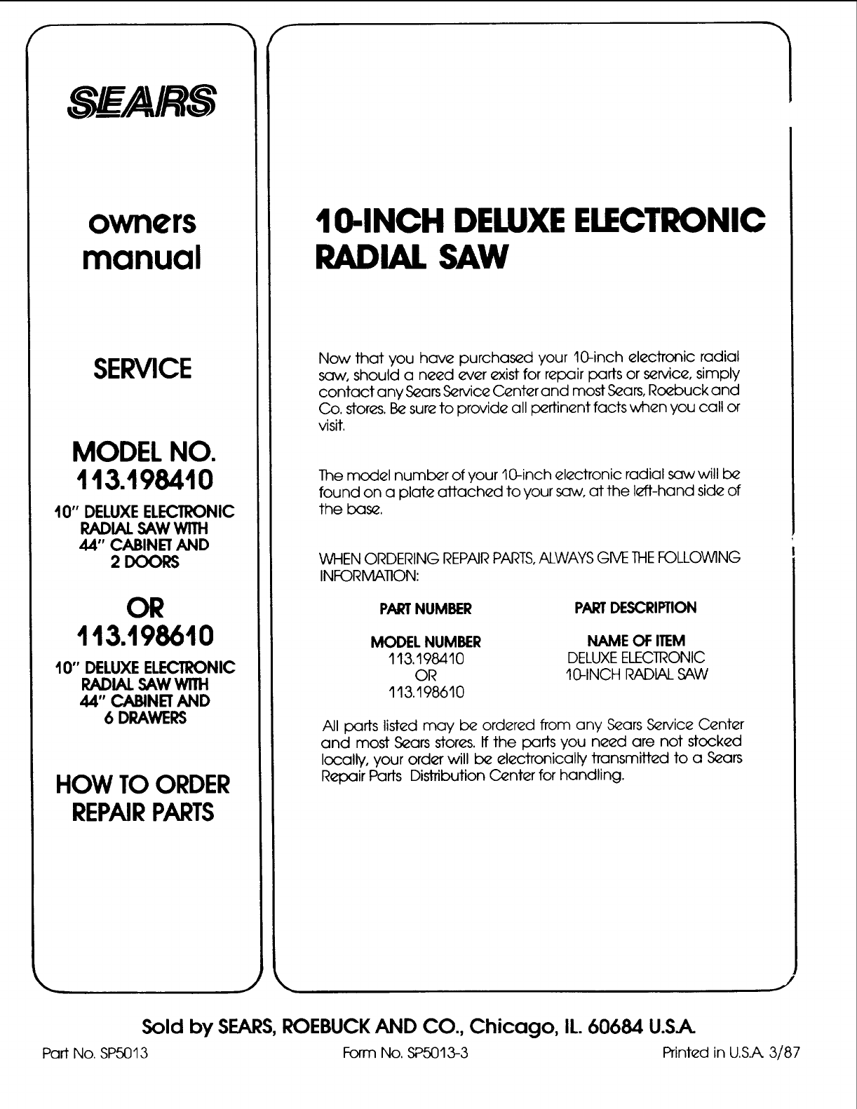 Part No. SP5013 Form No. SP5013-3 Printed in U.S.A. 3/87