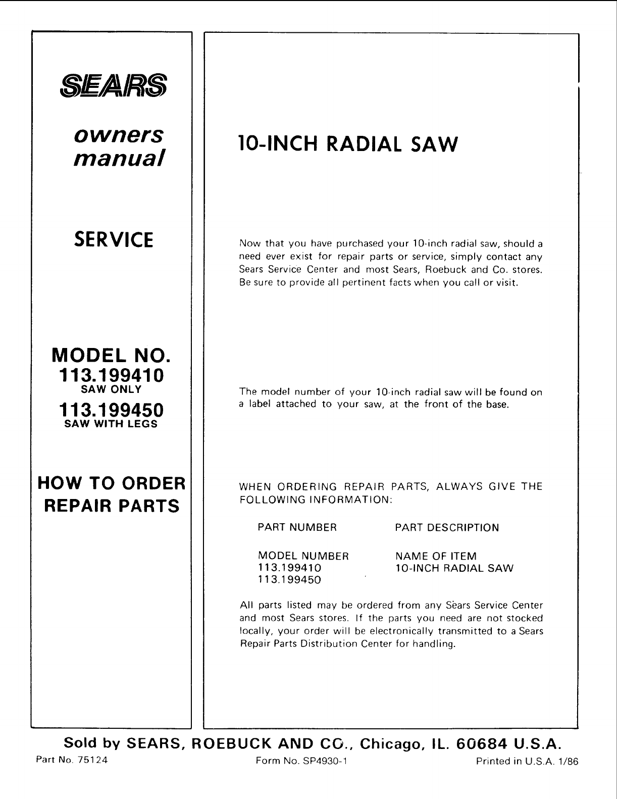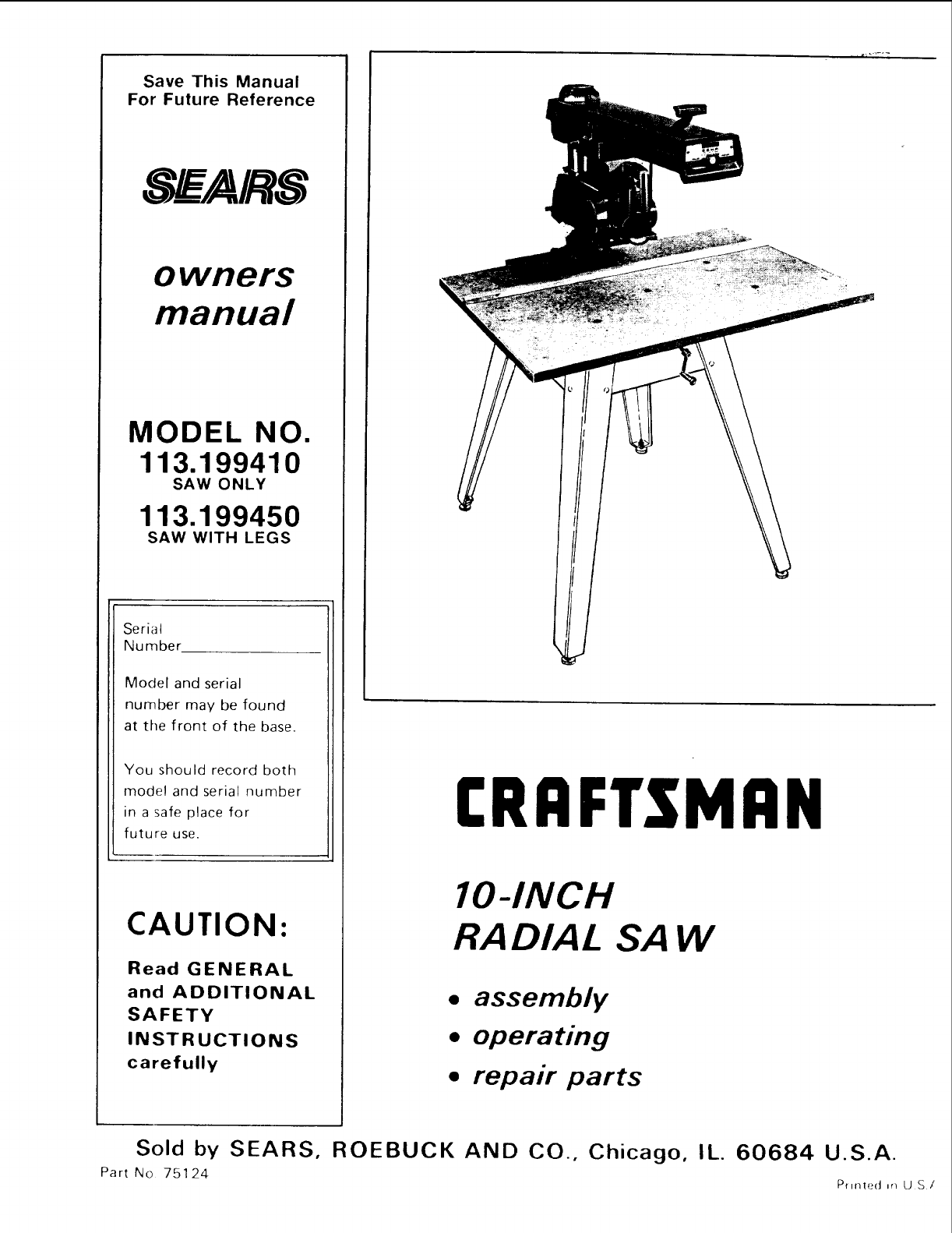 User Manual: Craftsman 113199410 113199410 CRAFTSMAN 10-INCH RADIAL SAW - Manuals and Guides View the owners manual for your CRAFTSMAN 10-INCH RADIAL SAW #113199410. Home:Tool Parts:Craftsman Parts:Craftsman 10-INCH RADIAL SAW Manual