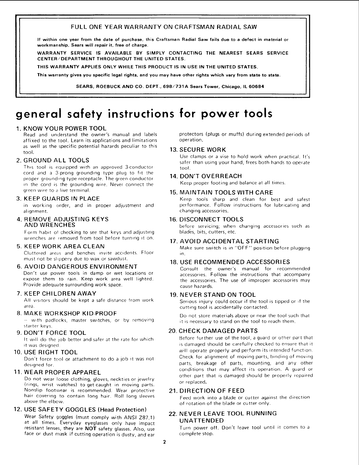 FULL ONE YEAR WARRANTY ON CRAFTSMAN RADIAL SAW
