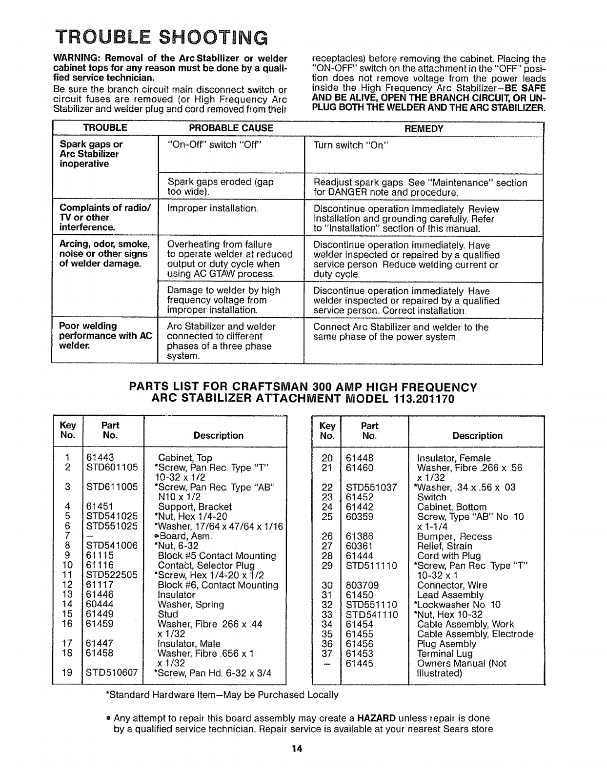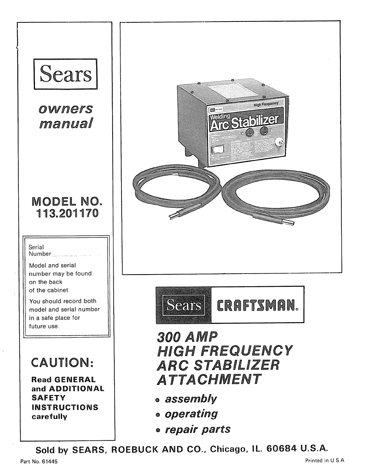 User Manual: Craftsman 113201170 113201170 CRAFTSMAN 300 AMP HIGH FREQUENCY ARC STABILIZER ATTACHMENT - Manuals and Guides View the owners manual for your CRAFTSMAN 300 AMP HIGH FREQUENCY ARC STABILIZER ATTACHMENT #113201170. Home:Tool Parts:Craftsman Parts:Craftsman 300 AMP HIGH FREQUENCY ARC STABILIZER ATTACHMENT Manual