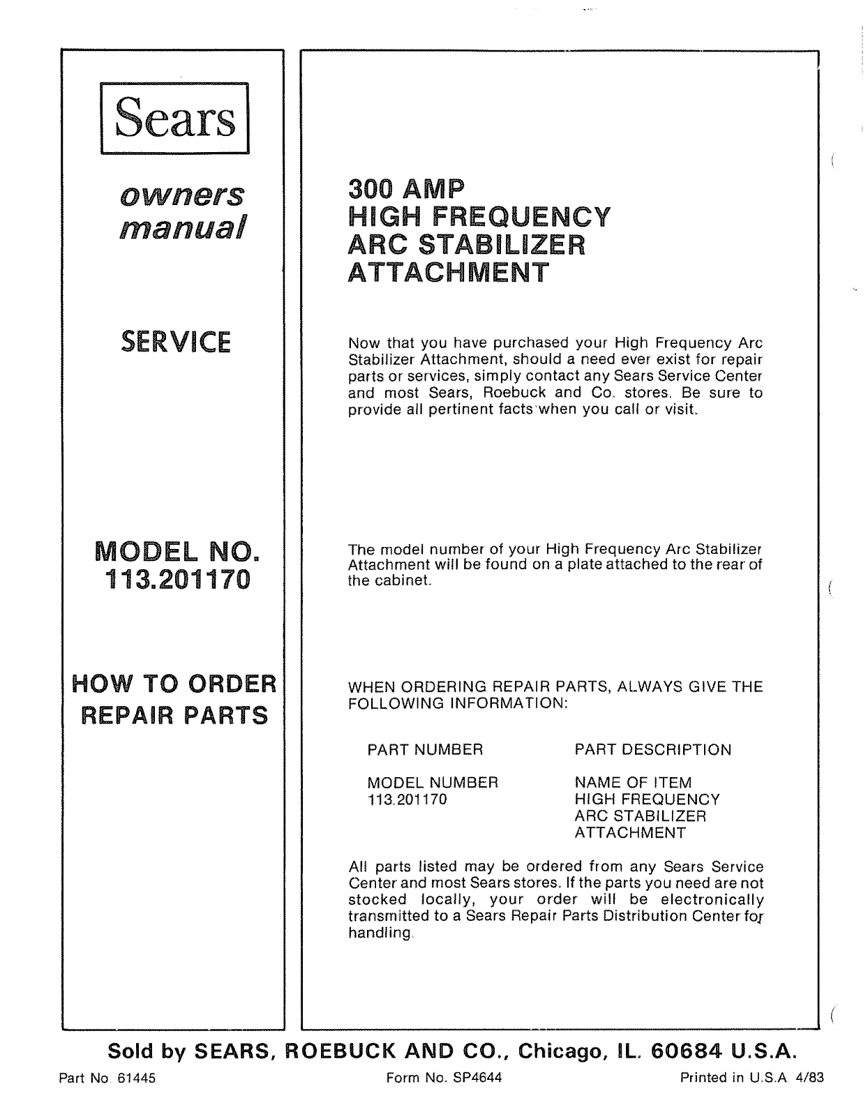 Part No 61445 Form No. SP4644 Printed in USA 4/83