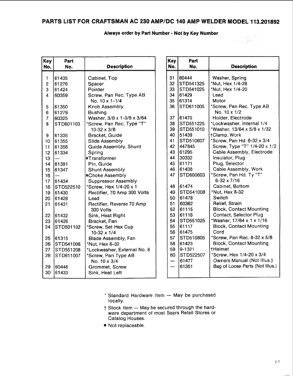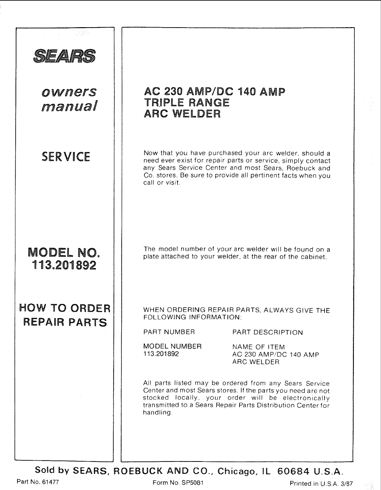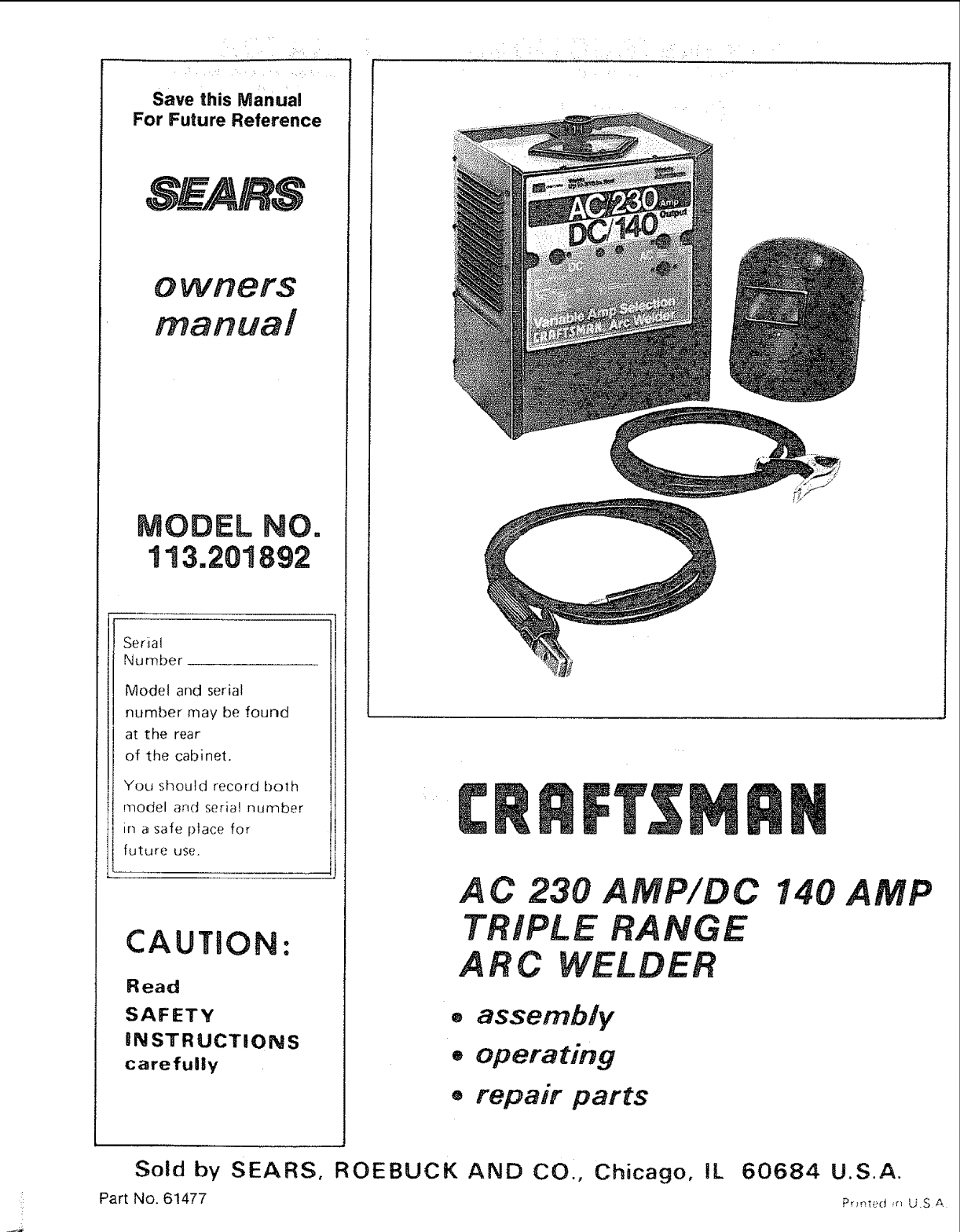 User Manual: Craftsman 113201892 113201892 CRAFTSMAN TRIPLE RANGE ARC WELDER - Manuals and Guides View the owners manual for your CRAFTSMAN TRIPLE RANGE ARC WELDER #113201892. Home:Tool Parts:Craftsman Parts:Craftsman TRIPLE RANGE ARC WELDER Manual