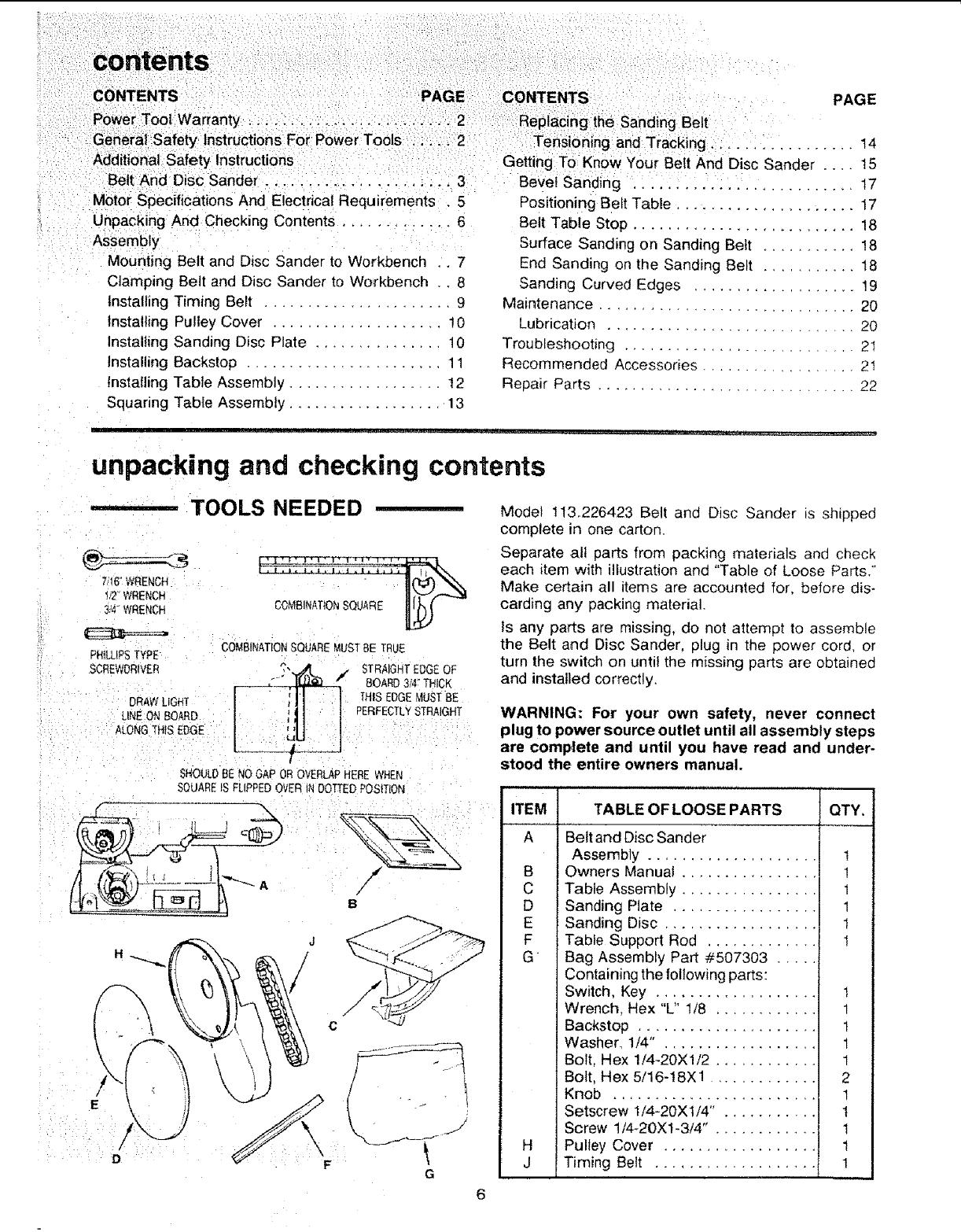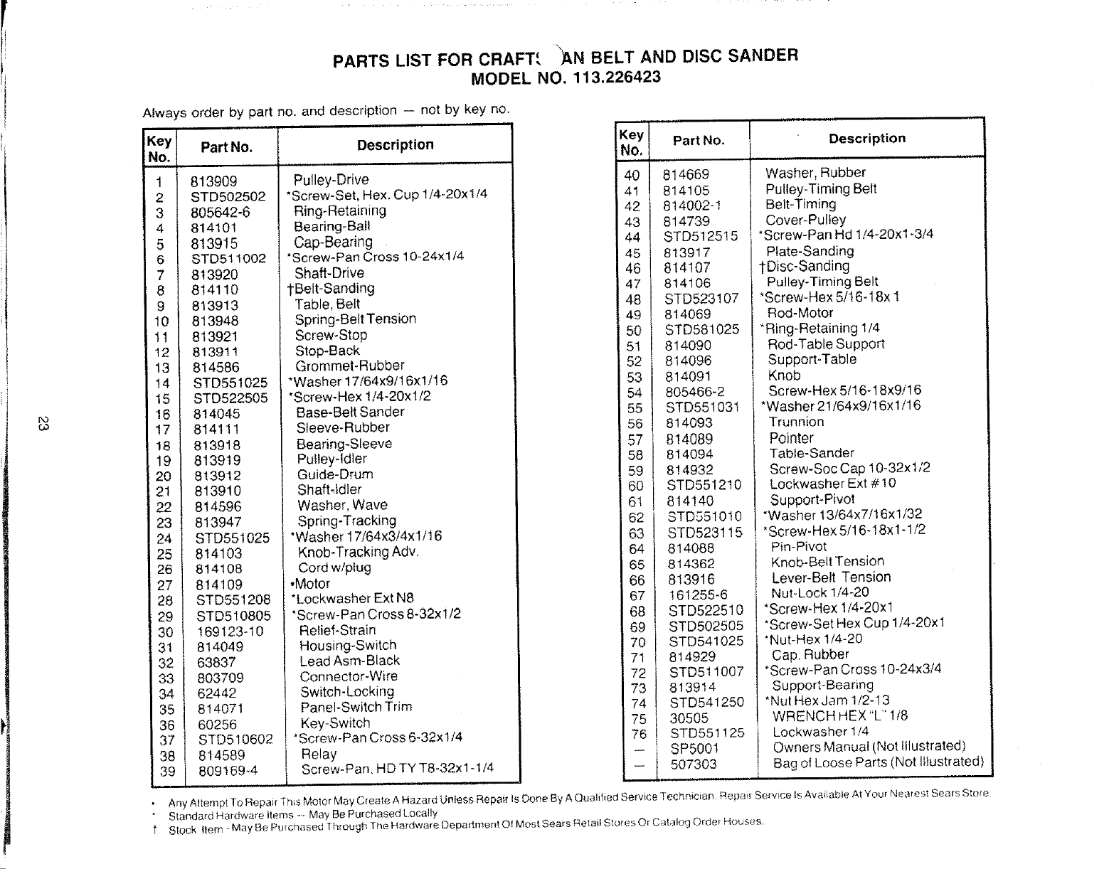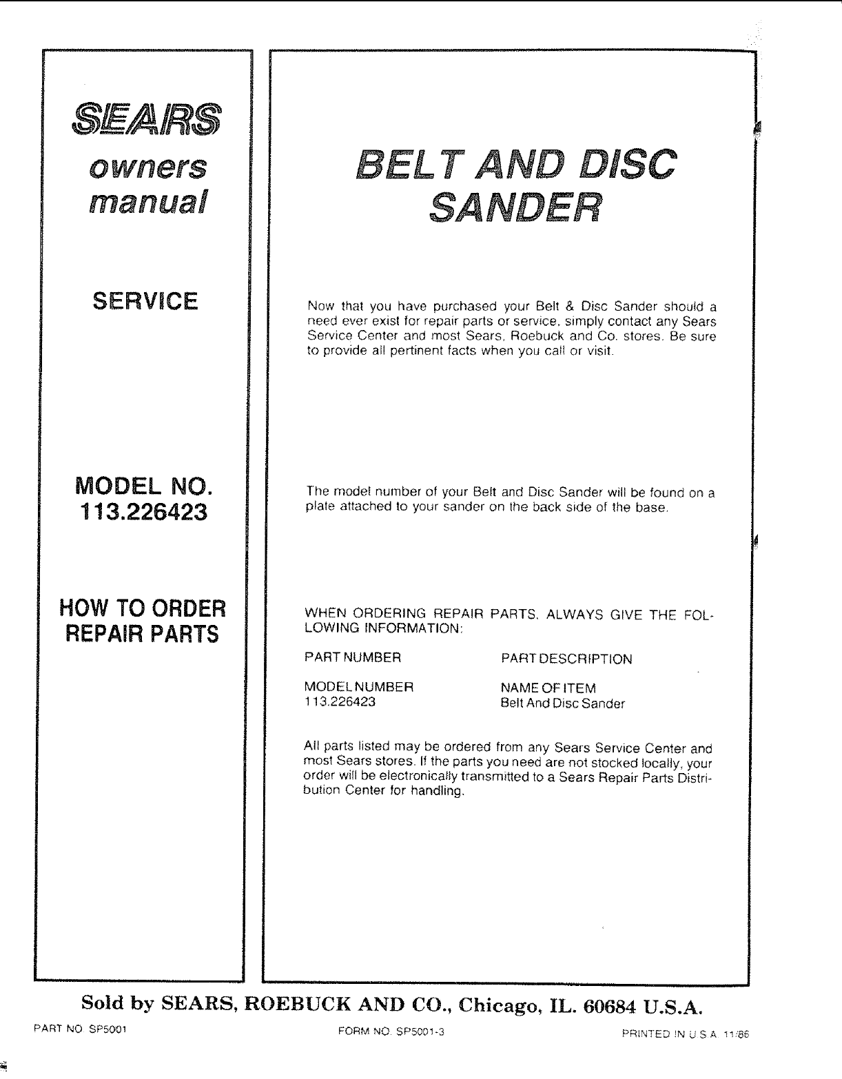 User Manual: Craftsman 113226423 113226423 CRAFTSMAN BELT AND DISC SANDER - Manuals and Guides View the owners manual for your CRAFTSMAN BELT AND DISC SANDER #113226423. Home:Tool Parts:Craftsman Parts:Craftsman BELT AND DISC SANDER Manual